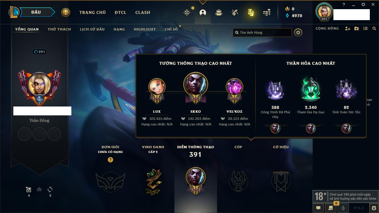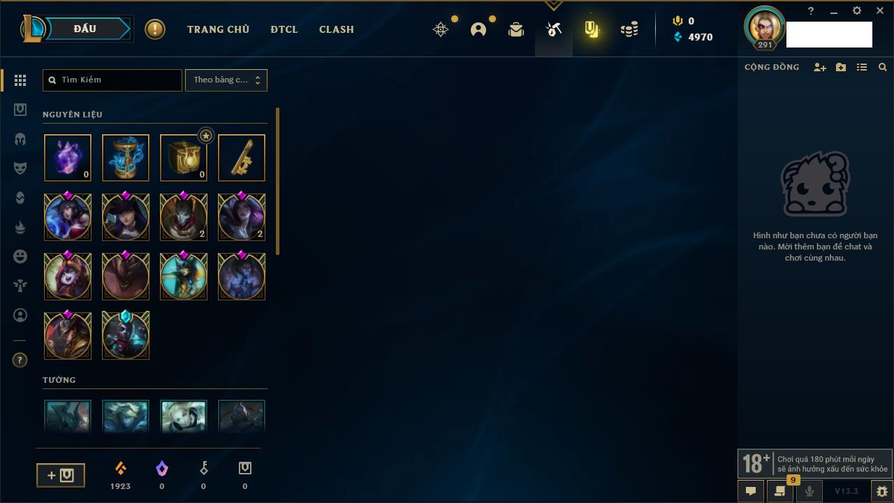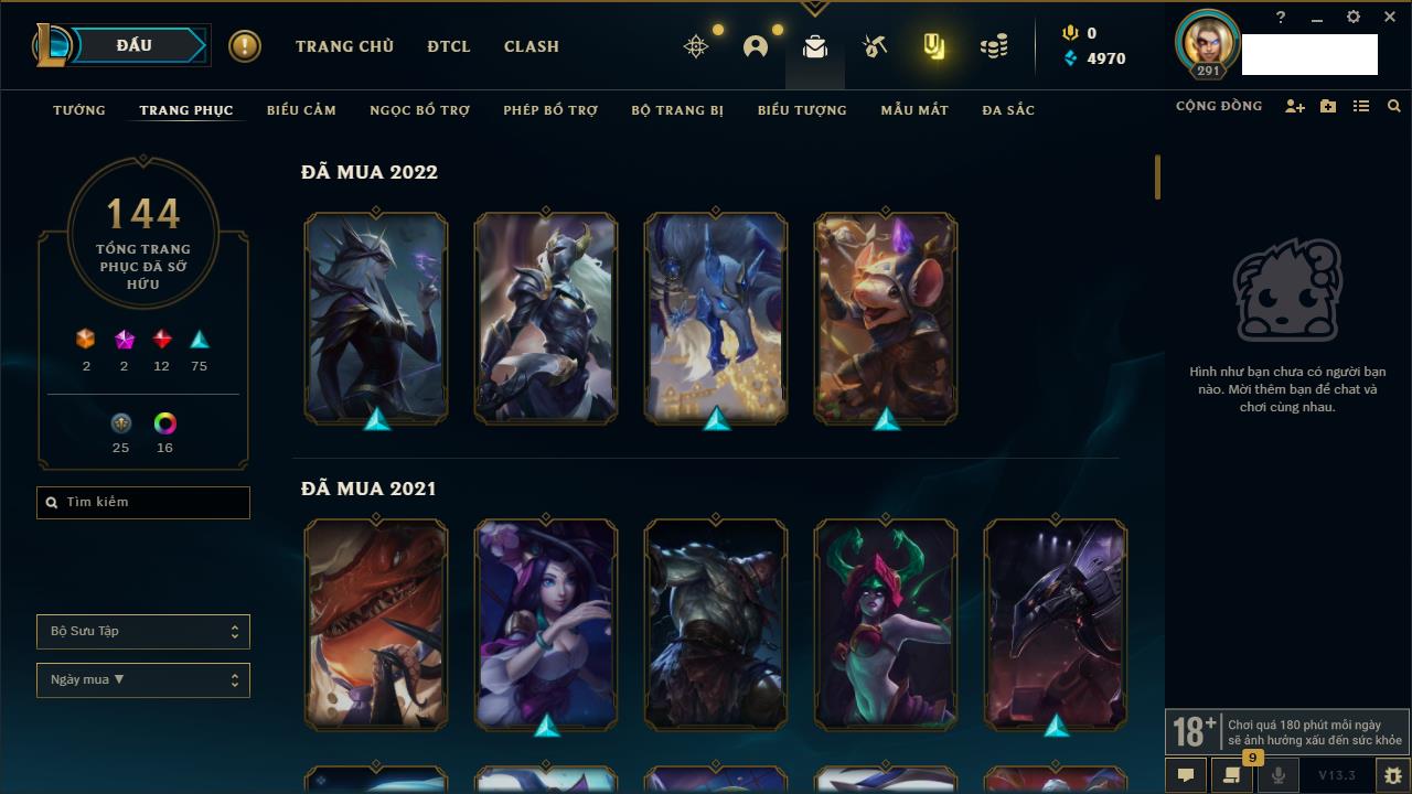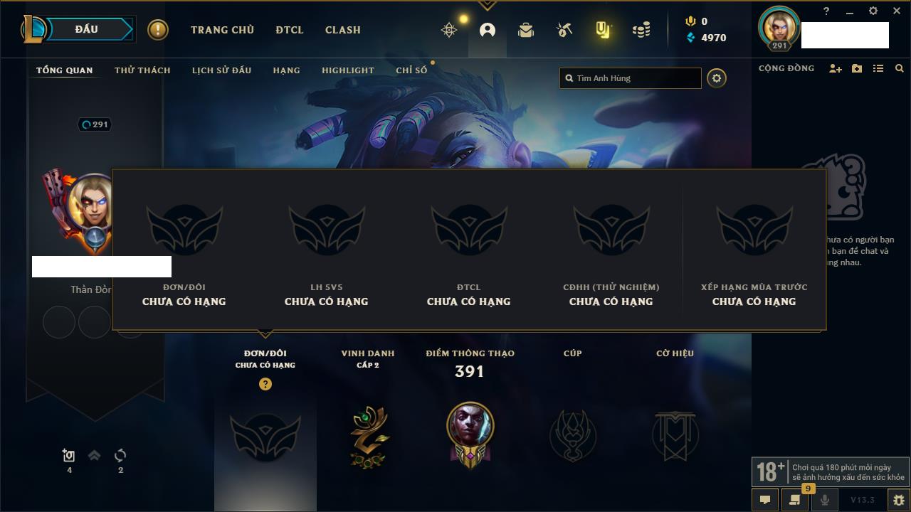 Rank Đơn: Chưa RankKhung: Chưa có khungTướng: 157 - Còn 6783 THXTrang Phục: 50Rank ĐTCL: Chưa RankLinh Thú: 37