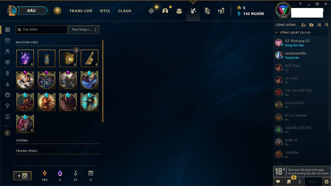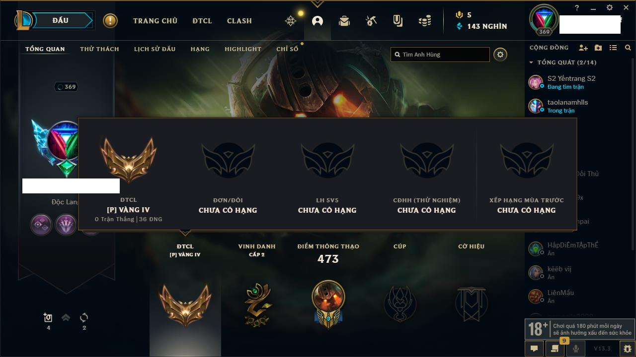 Rank Đơn: Bạc IVKhung: BạcTướng: 171 - Còn 102637 THXTrang Phục: 169Rank ĐTCL: Vàng IILinh Thú: 127