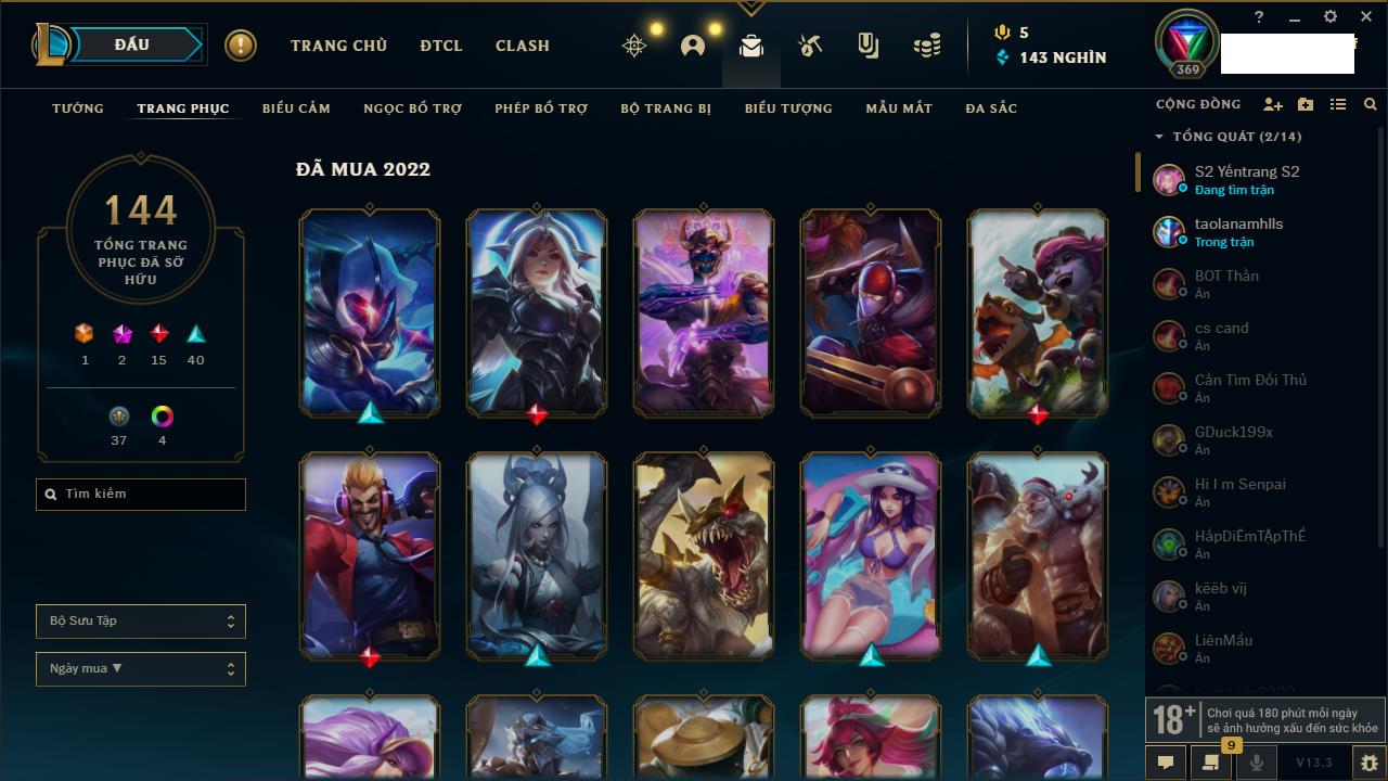 Rank Đơn: Bạc IIIKhung: BạcTướng: 168 - Còn 101710 THXTrang Phục: 184Rank ĐTCL: Chưa RankLinh Thú: 17