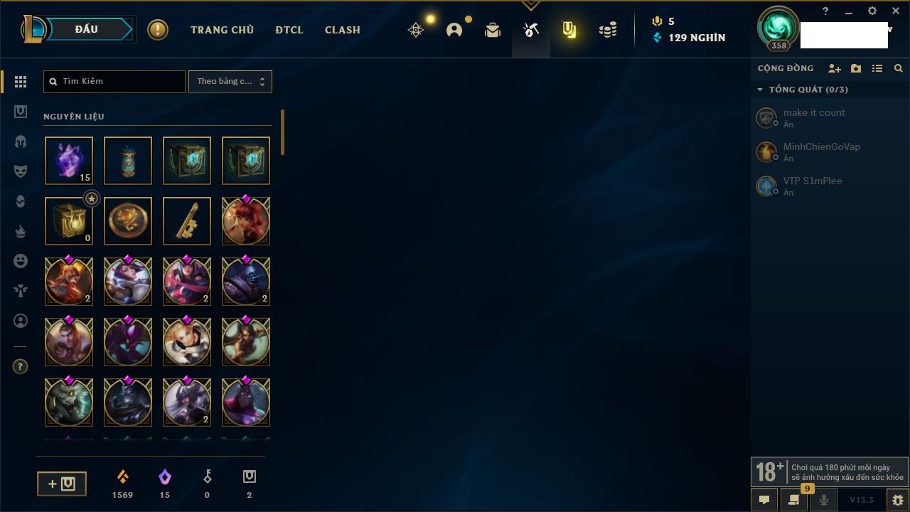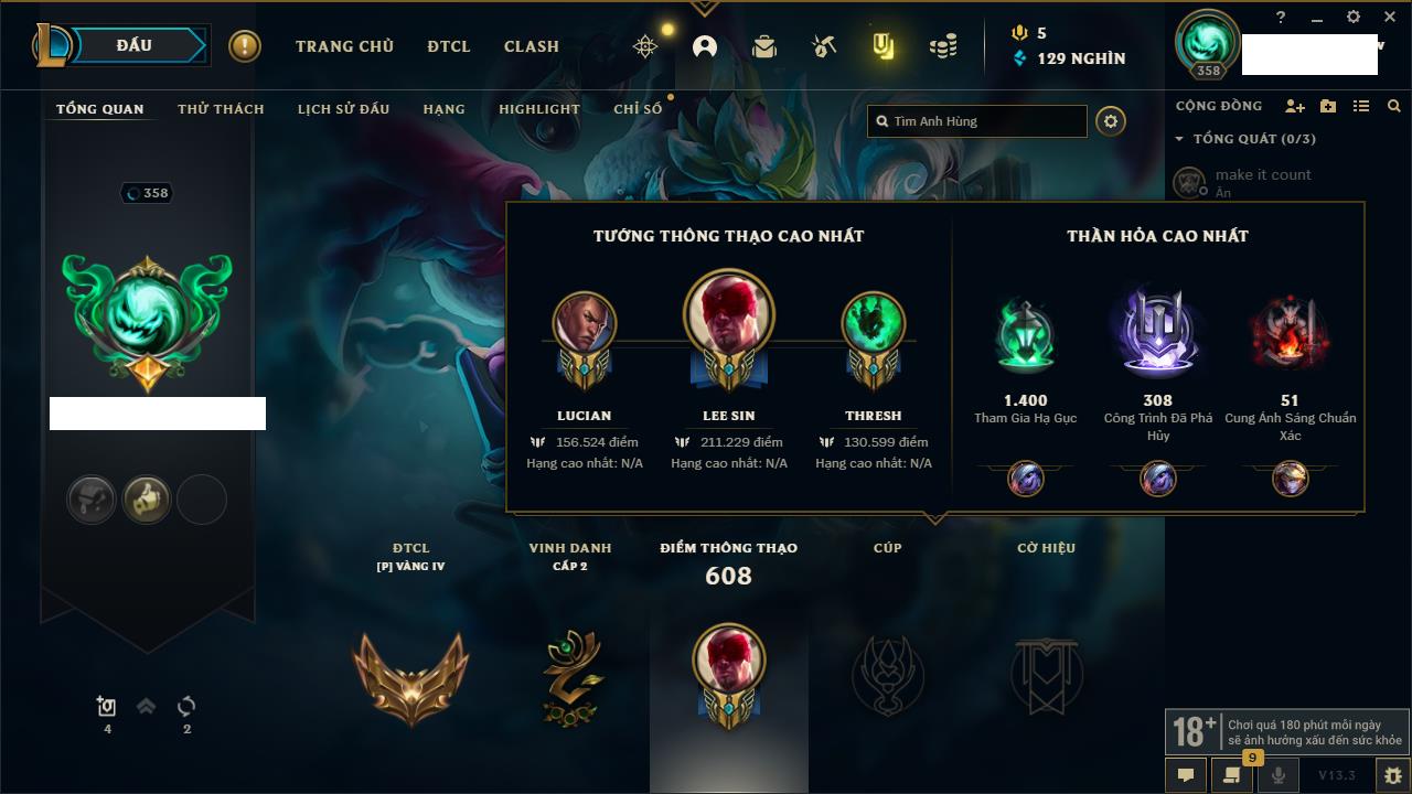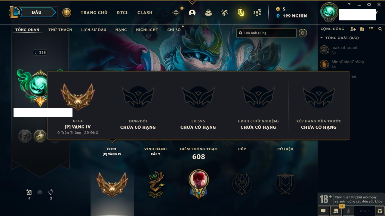 Rank Đơn: Chưa RankKhung: Chưa có khungTướng: 137 - Còn 6310 THXTrang Phục: 77Rank ĐTCL: Chưa RankLinh Thú: 13