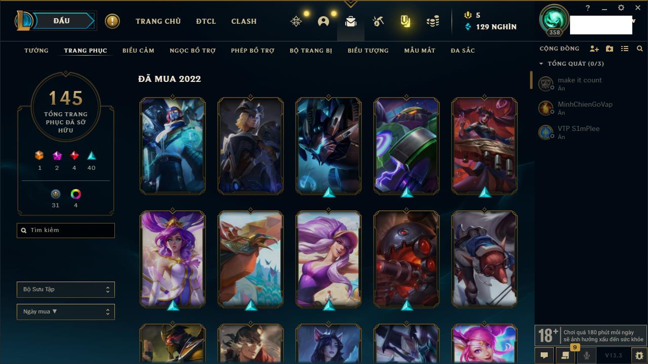 Rank Đơn: Chưa RankKhung: Chưa có khungTướng: 162 - Còn 129202 THXTrang Phục: 145Rank ĐTCL: Chưa RankLinh Thú: 48