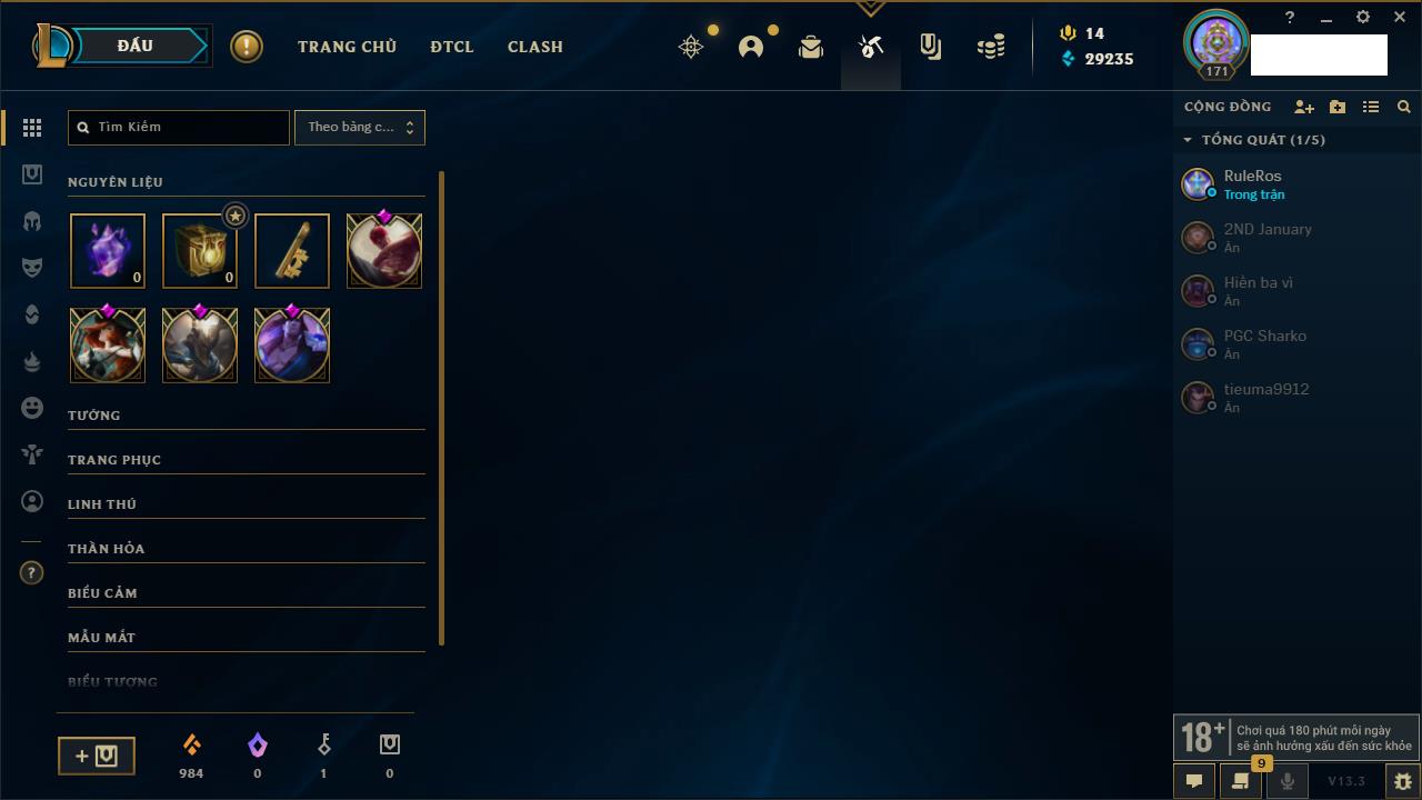 Rank Đơn: Chưa rank mùa nàoKhung: Chưa có khungTướng: 0 - Còn 2000 THXTrang Phục: 0Rank ĐTCL: Chưa RankLinh Thú: 14