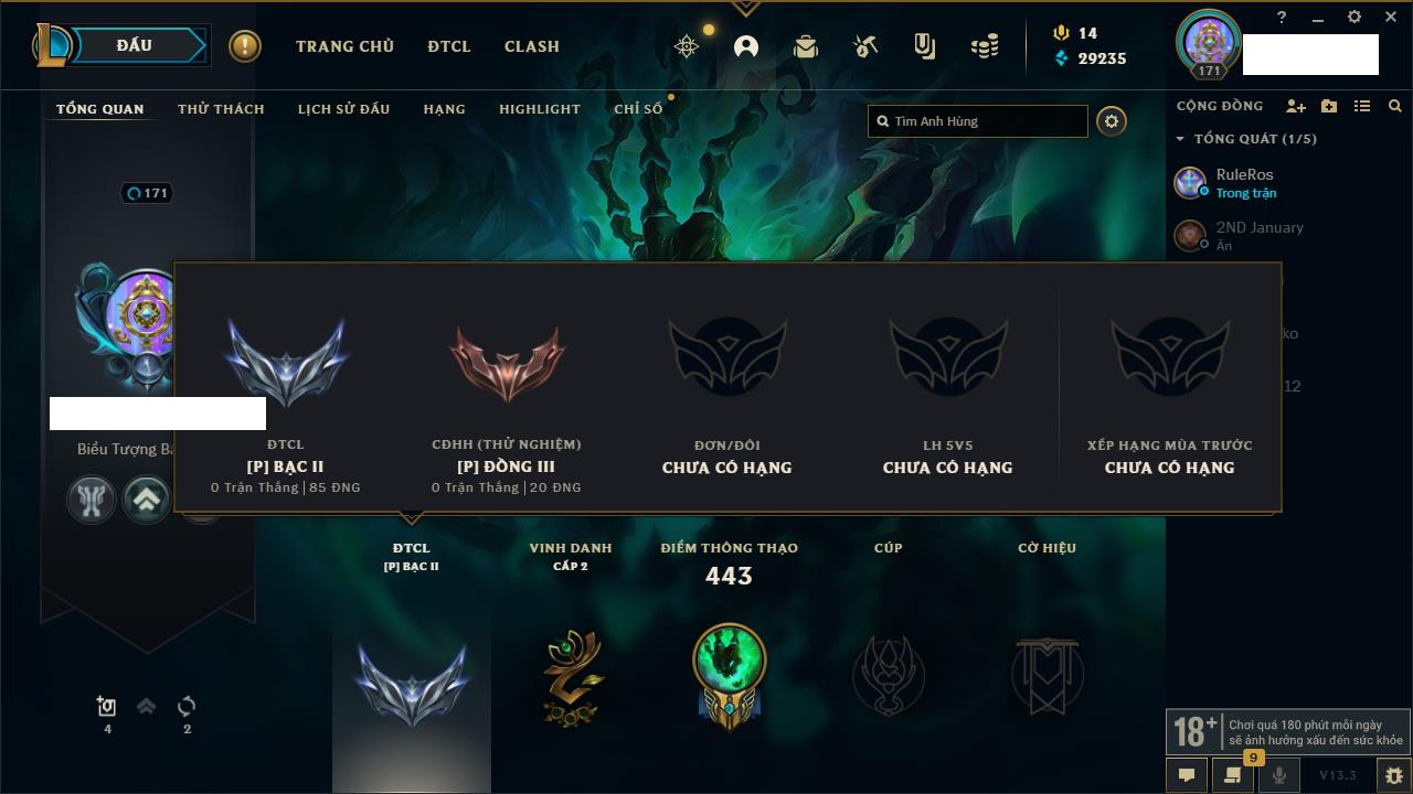 Rank Đơn: Chưa RankKhung: BạcTướng: 141 - Còn 299 THXTrang Phục: 101Rank ĐTCL: Chưa RankLinh Thú: 84