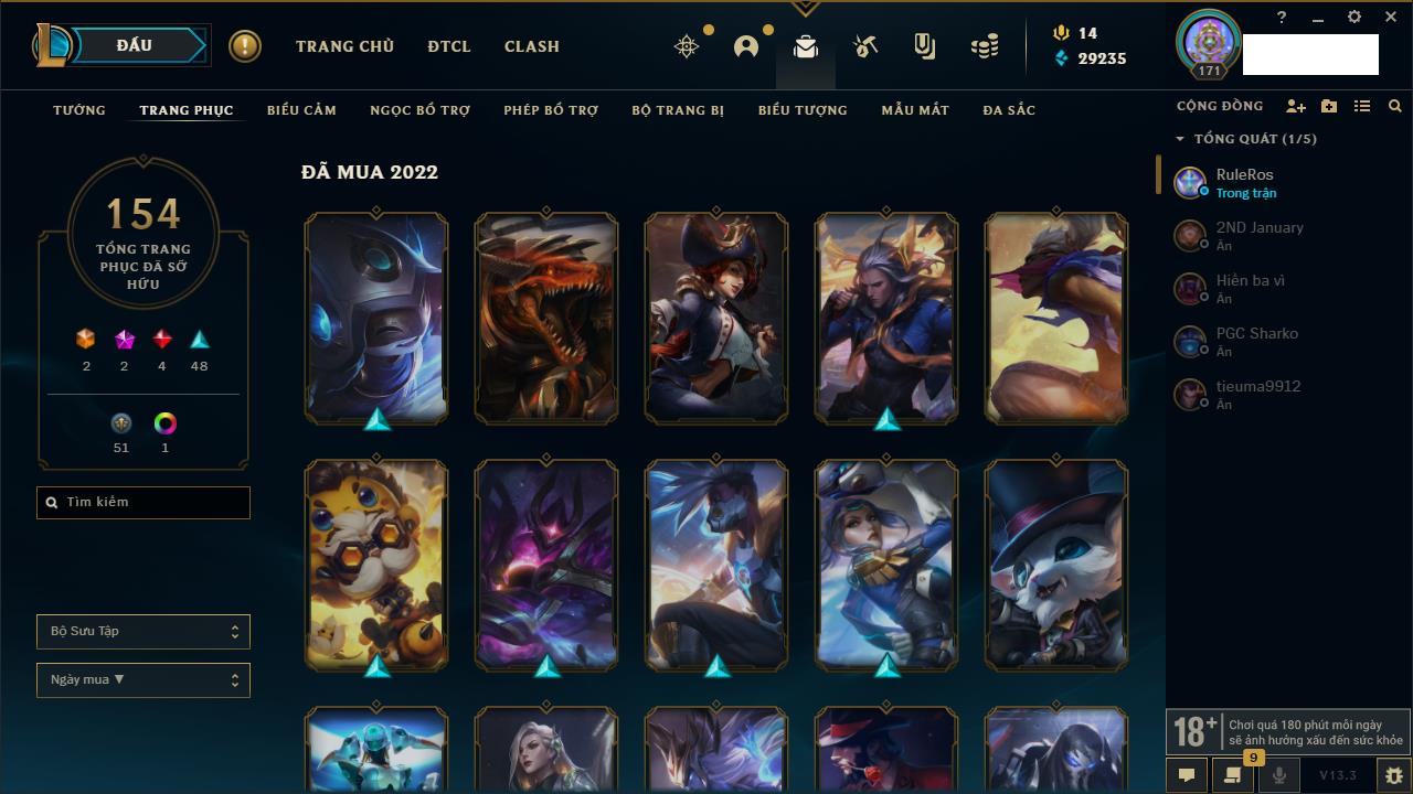 Rank Đơn: Chưa RankKhung: Chưa có khungTướng: 154 - Còn 18477 THXTrang Phục: 127Rank ĐTCL: Vàng ILinh Thú: 183