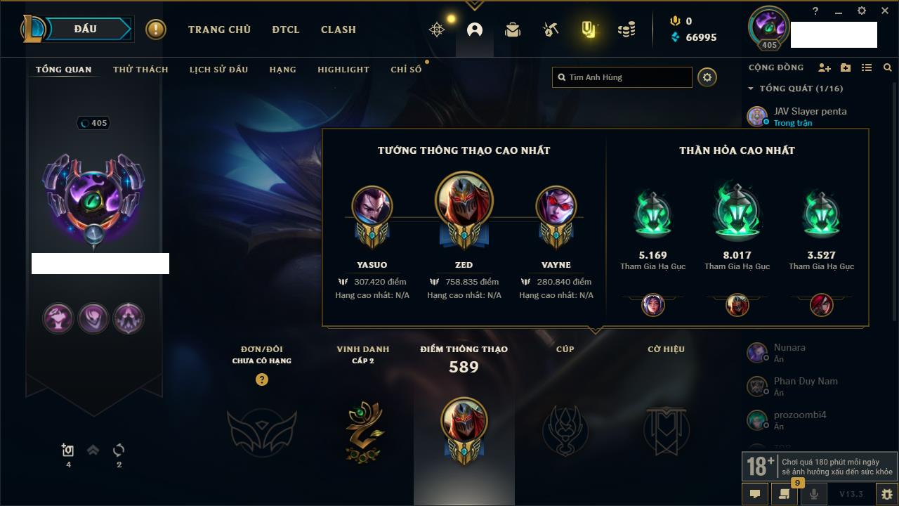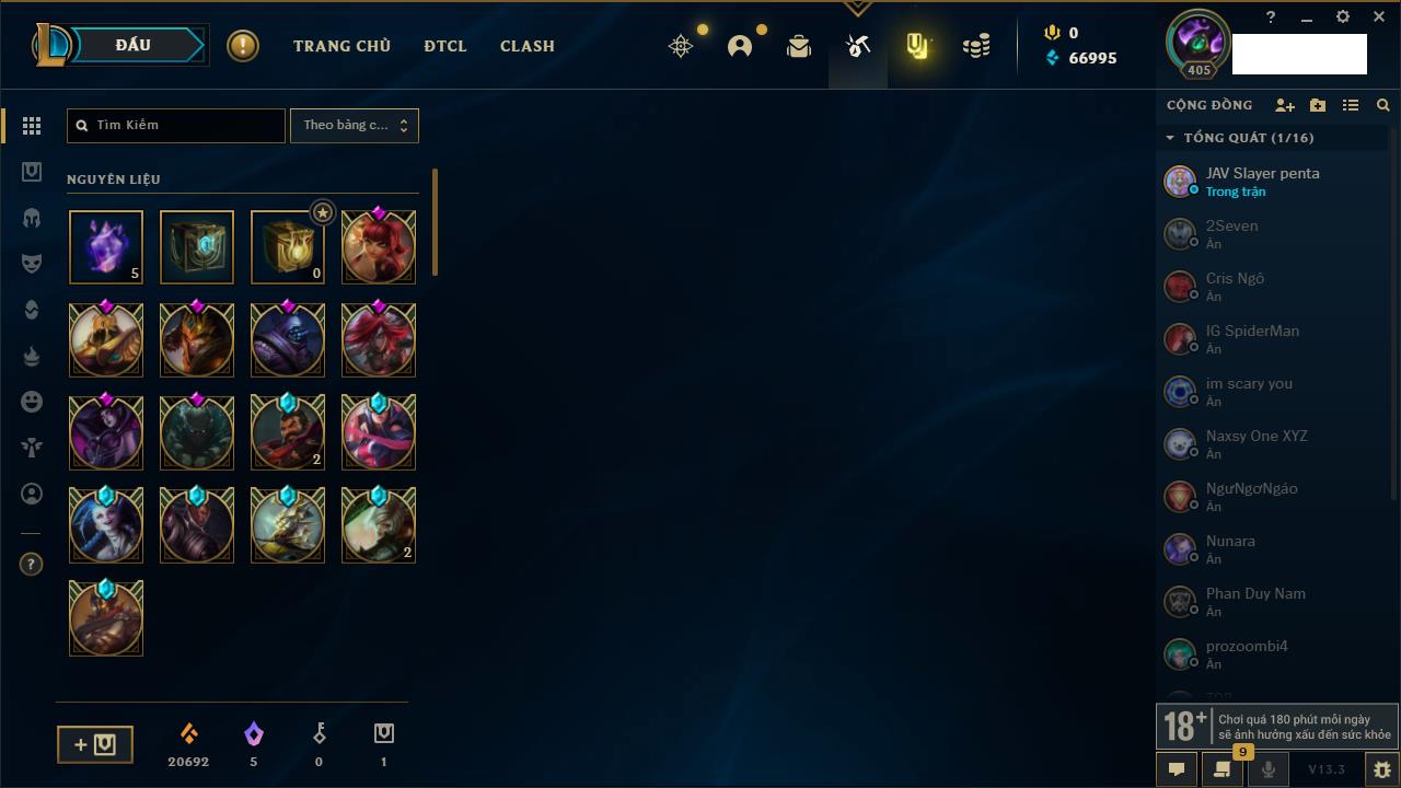 Rank Đơn: Vàng IVKhung: BạcTướng: 166 - Còn 180925 THXTrang Phục: 163Rank ĐTCL: Chưa RankLinh Thú: 67