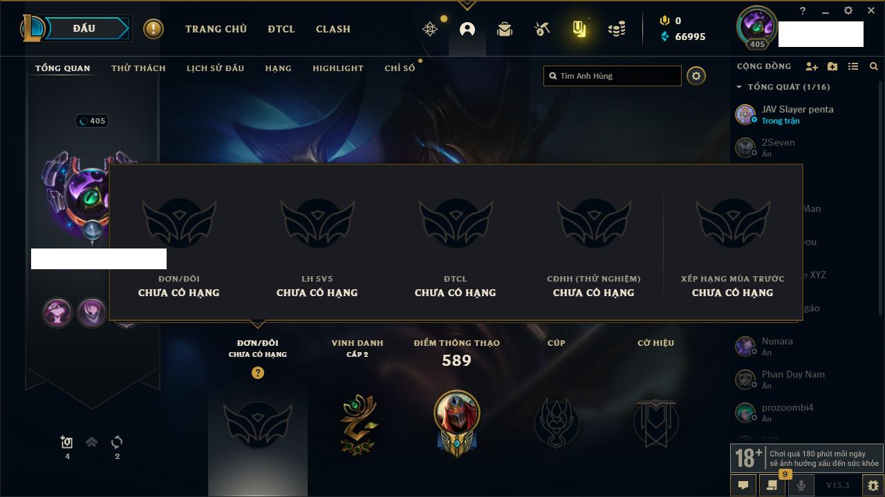 Rank Đơn: Bạc IIKhung: VàngTướng: 171 - Còn 332462 THXTrang Phục: 165Rank ĐTCL: Kim Cương IVLinh Thú: 181
