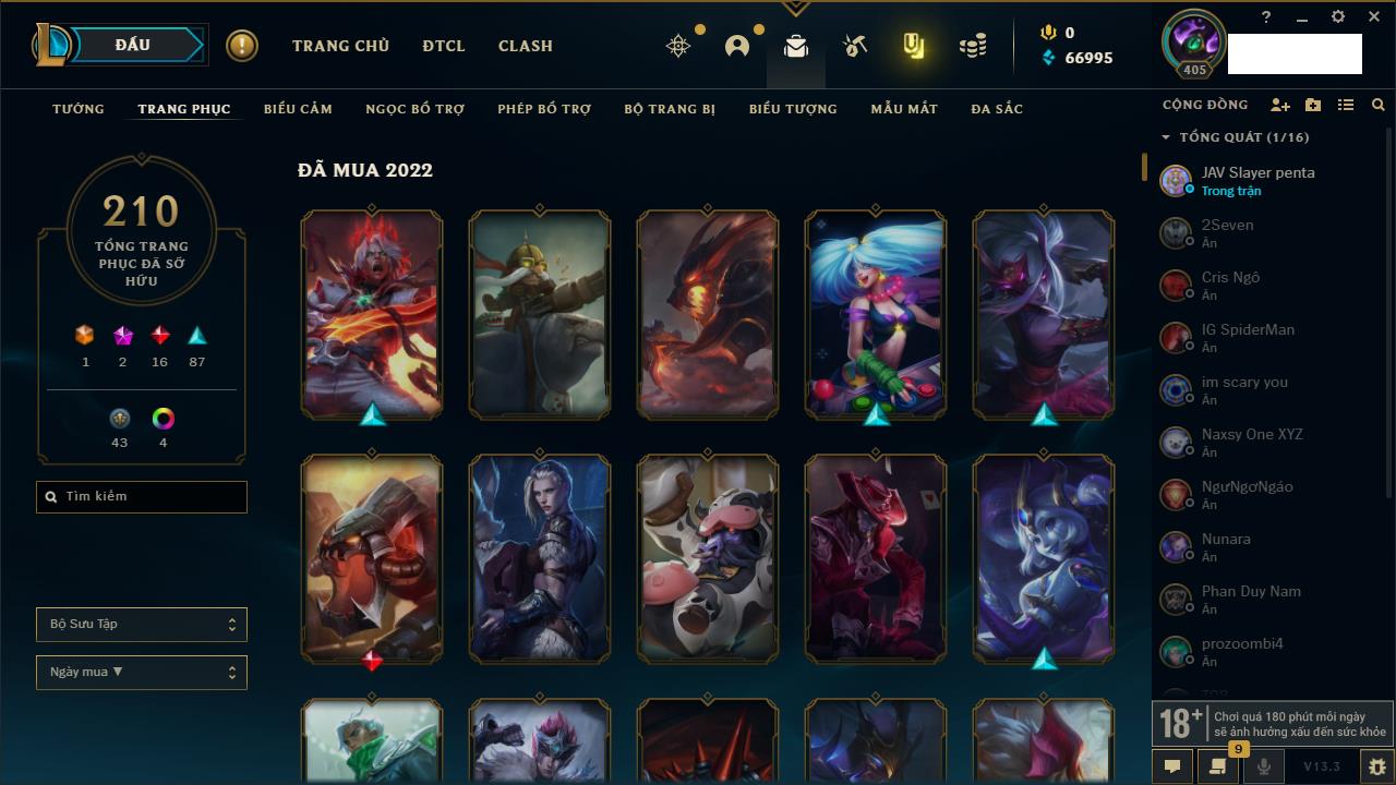 Rank Đơn: Vàng IVKhung: VàngTướng: 171 - Còn 48721 THXTrang Phục: 171Rank ĐTCL: Chưa RankLinh Thú: 27