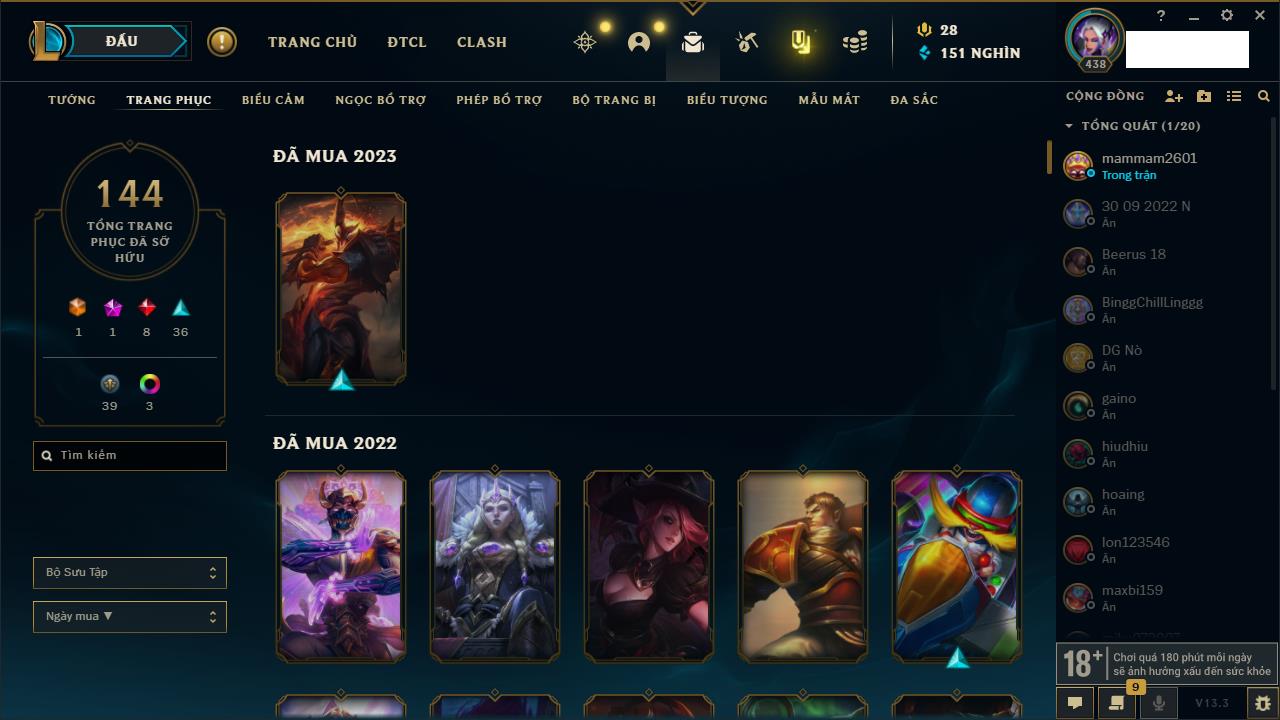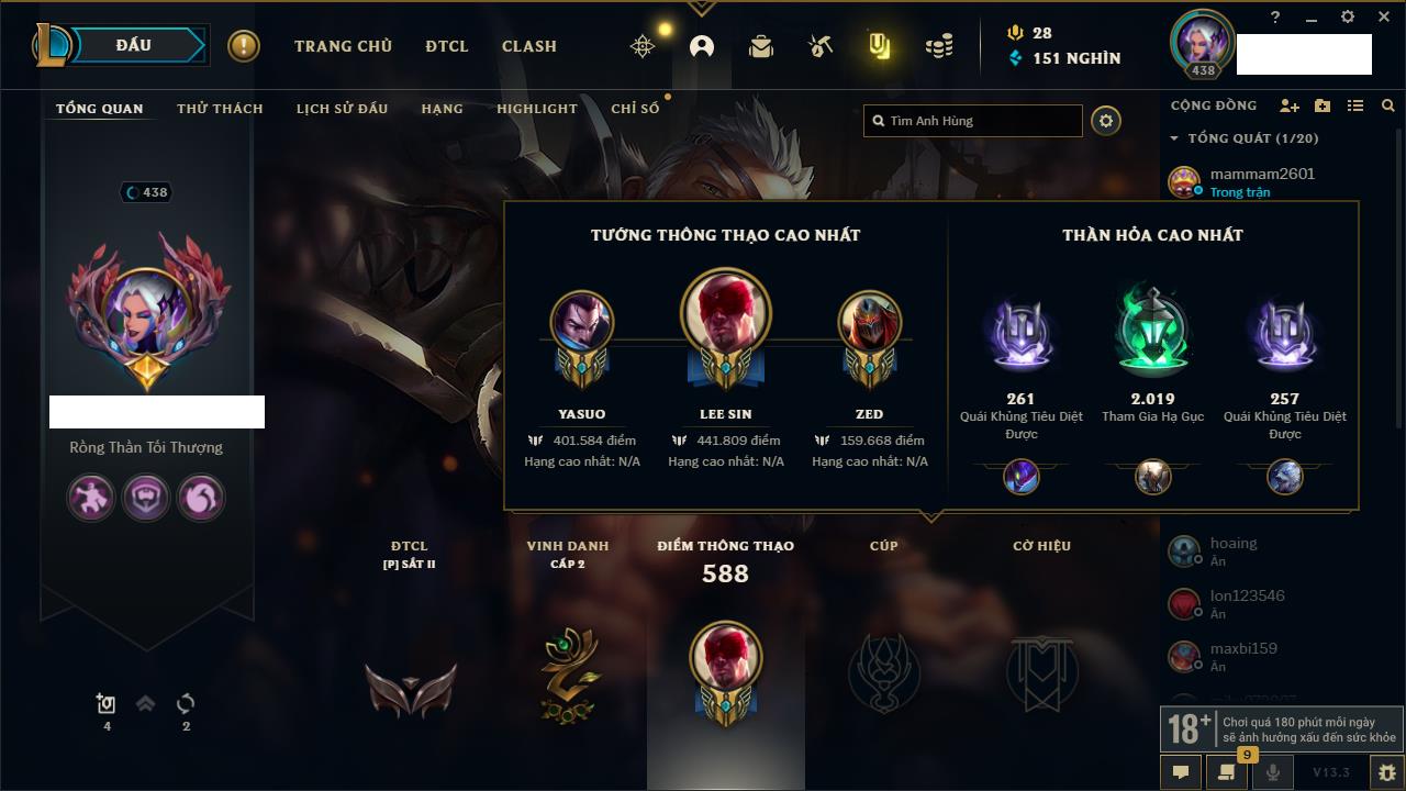 Rank Đơn: Bạc IIIKhung: BạcTướng: 168 - Còn 101710 THXTrang Phục: 184Rank ĐTCL: Chưa RankLinh Thú: 17