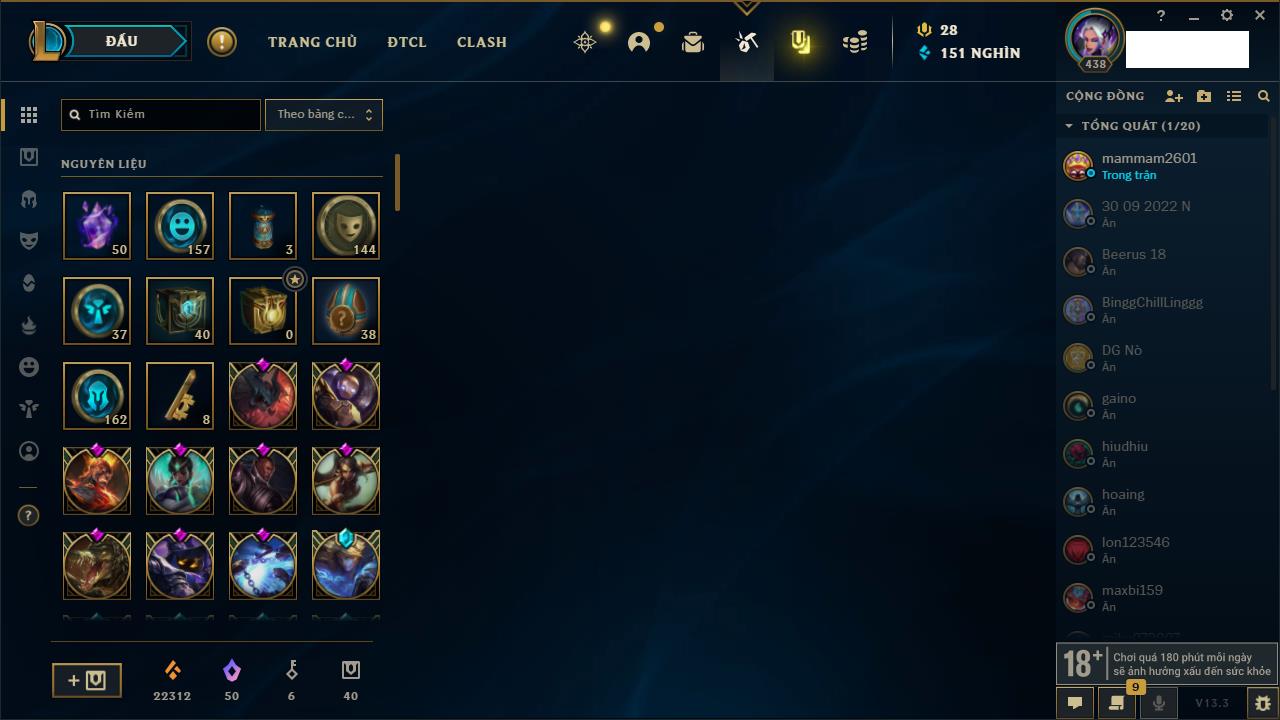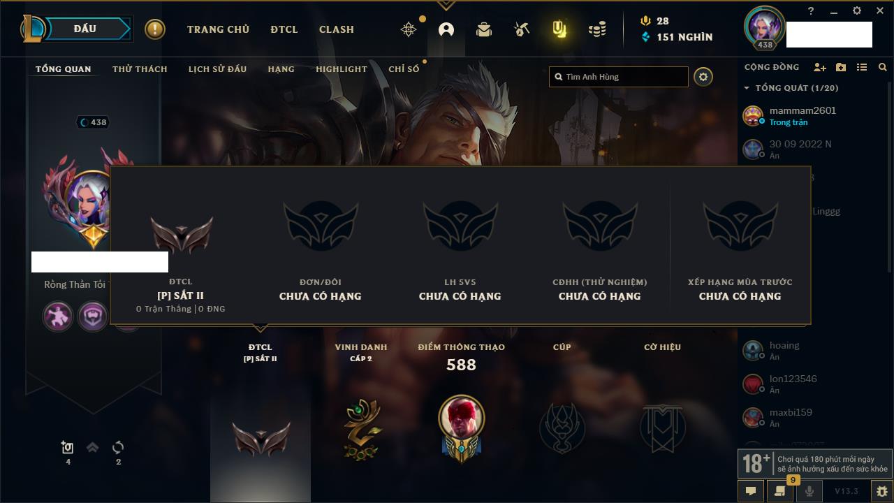 Rank Đơn: Bạc IVKhung: BạcTướng: 171 - Còn 161685 THXTrang Phục: 139Rank ĐTCL: Đồng ILinh Thú: 51