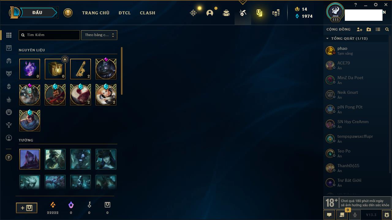 Rank Đơn: Chưa RankKhung: Chưa có khungTướng: 162 - Còn 23234 THXTrang Phục: 150Rank ĐTCL: Chưa RankLinh Thú: 42