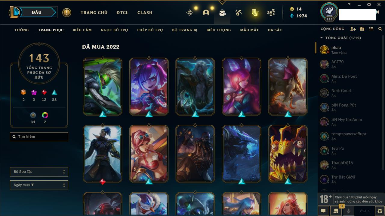 Rank Đơn: Chưa RankKhung: Chưa có khungTướng: 163 - Còn 157403 THXTrang Phục: 149Rank ĐTCL: Chưa RankLinh Thú: 122