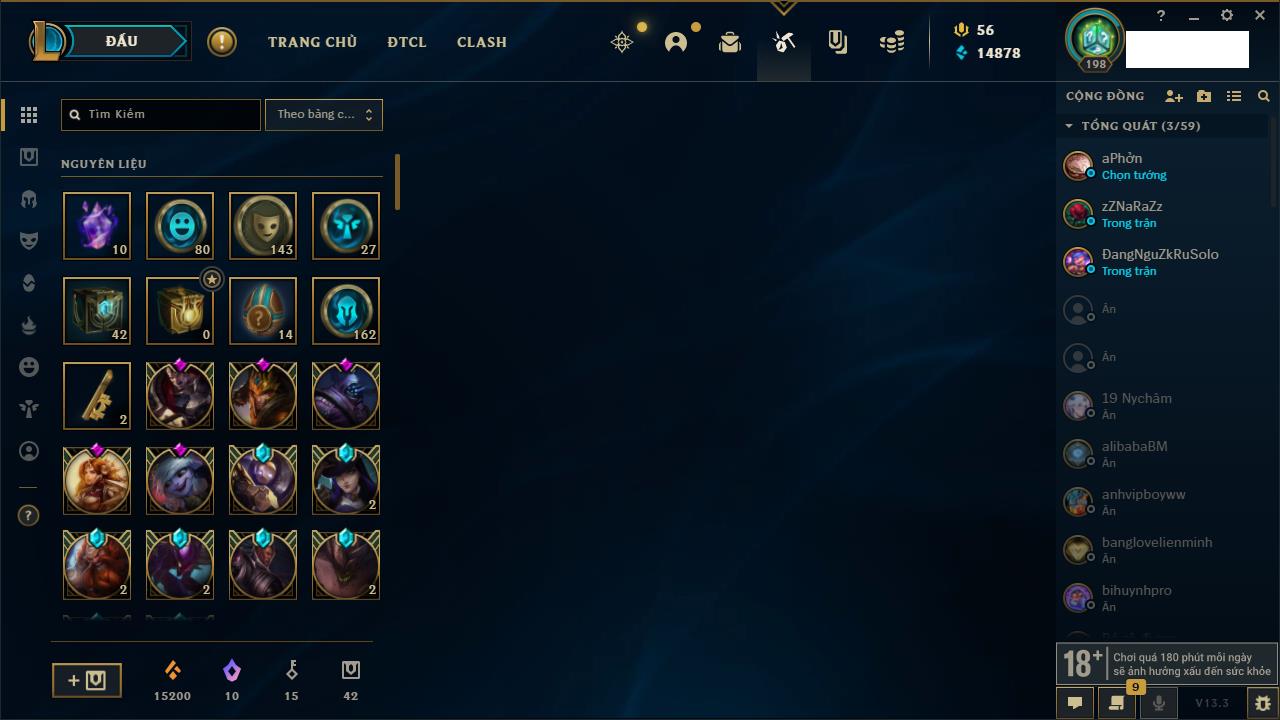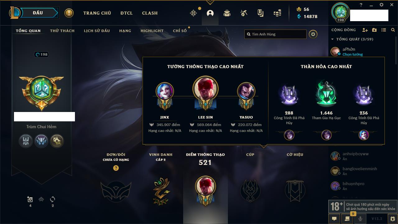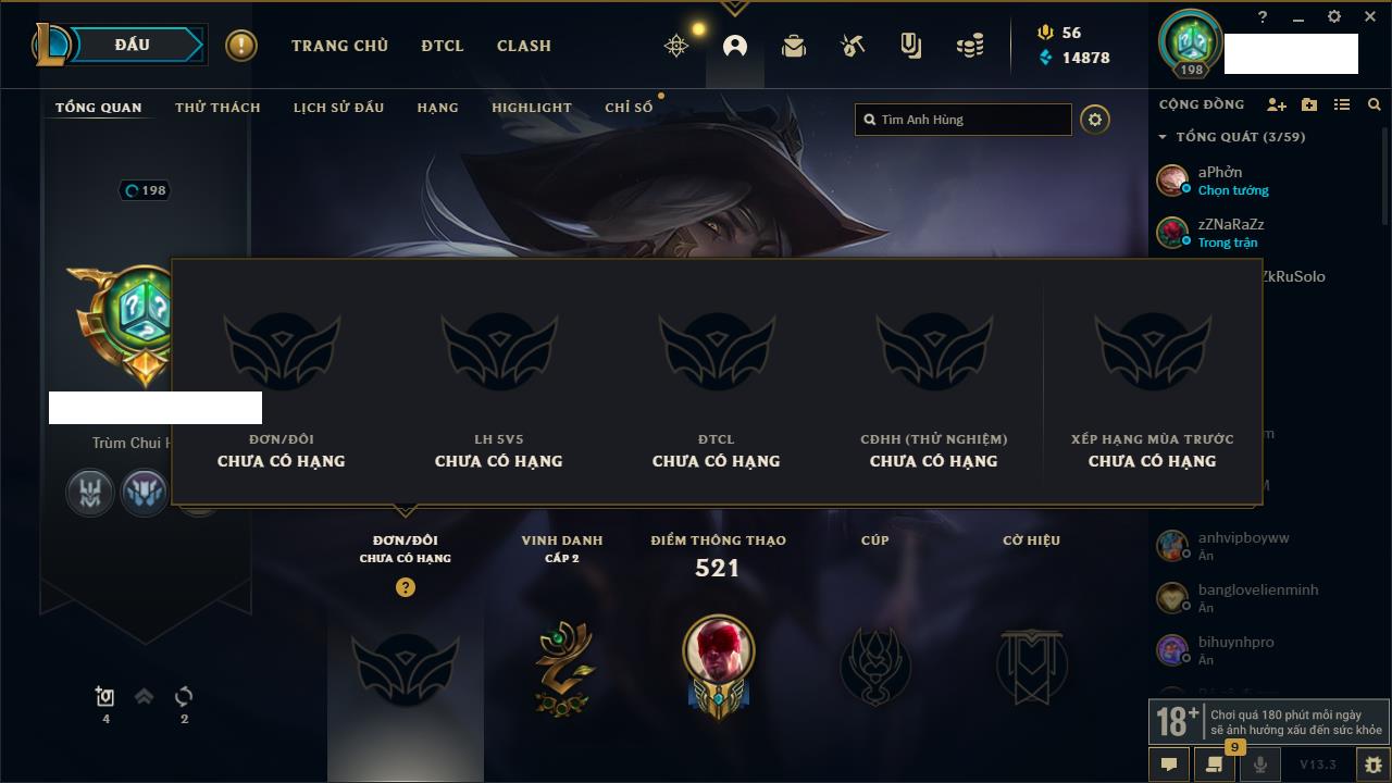 Rank Đơn: Bạc IVKhung: BạcTướng: 171 - Còn 102637 THXTrang Phục: 169Rank ĐTCL: Vàng IILinh Thú: 127