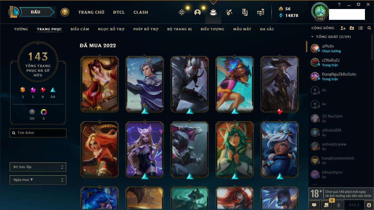 Rank Đơn: Bạc IIIKhung: BạcTướng: 168 - Còn 101710 THXTrang Phục: 184Rank ĐTCL: Chưa RankLinh Thú: 17
