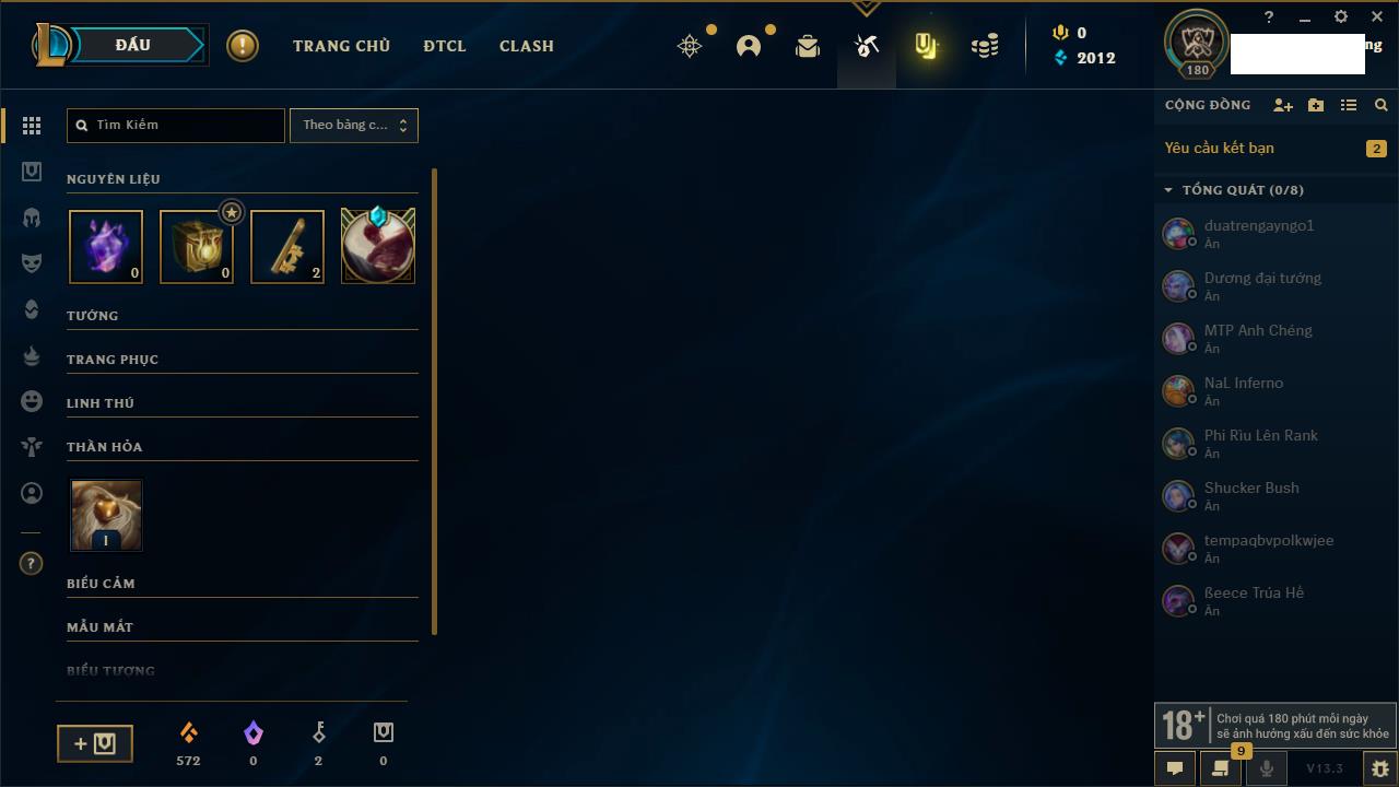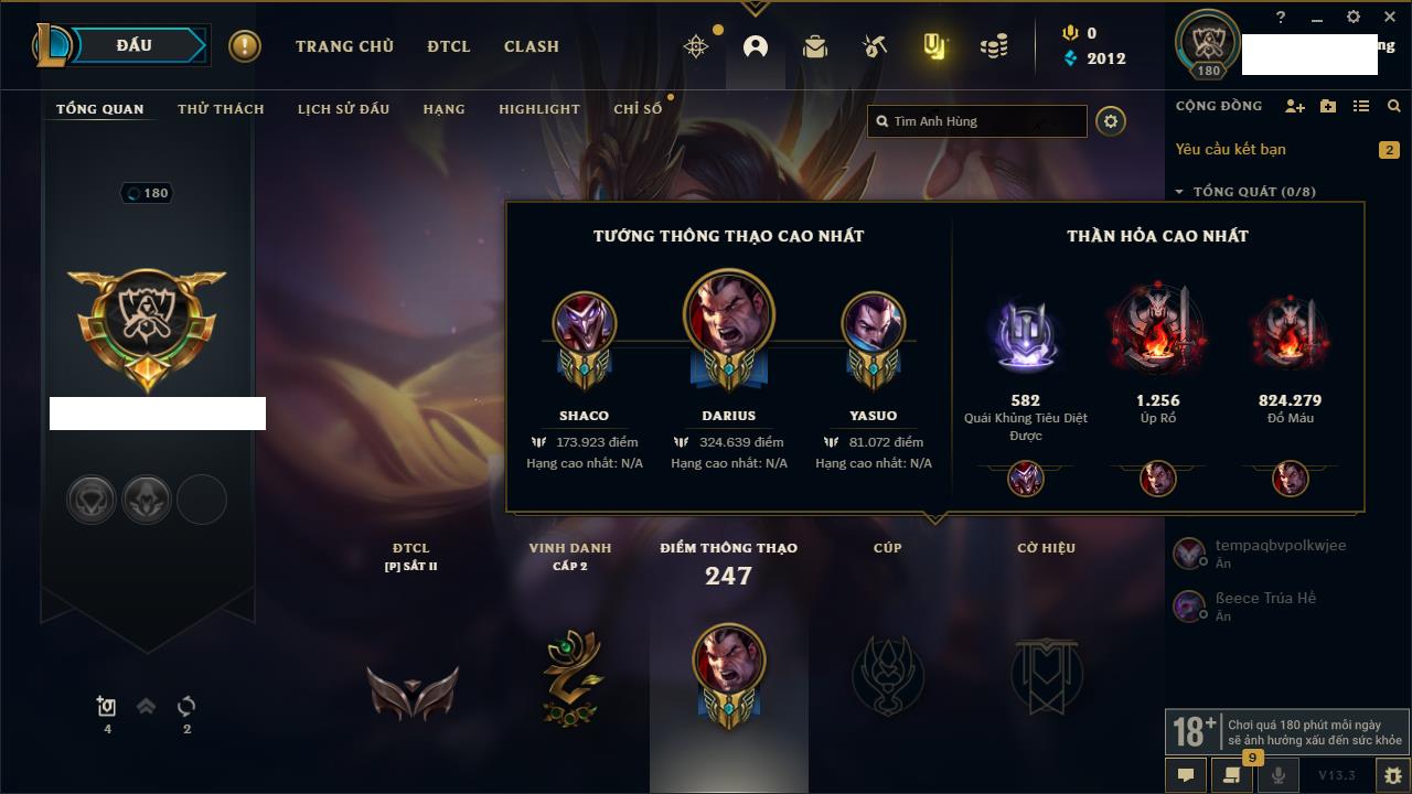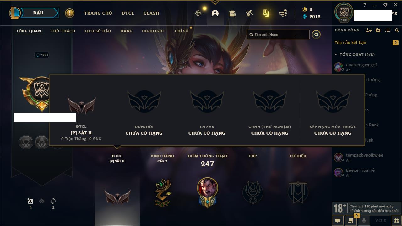 Rank Đơn: Đồng IIKhung: Chưa có khungTướng: 170 - Còn 56487 THXTrang Phục: 90Rank ĐTCL: Chưa RankLinh Thú: 129