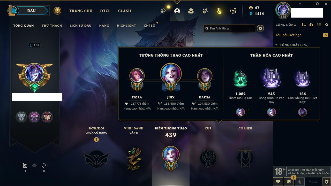 Rank Đơn: Chưa RankKhung: Chưa có khungTướng: 157 - Còn 6783 THXTrang Phục: 50Rank ĐTCL: Chưa RankLinh Thú: 37