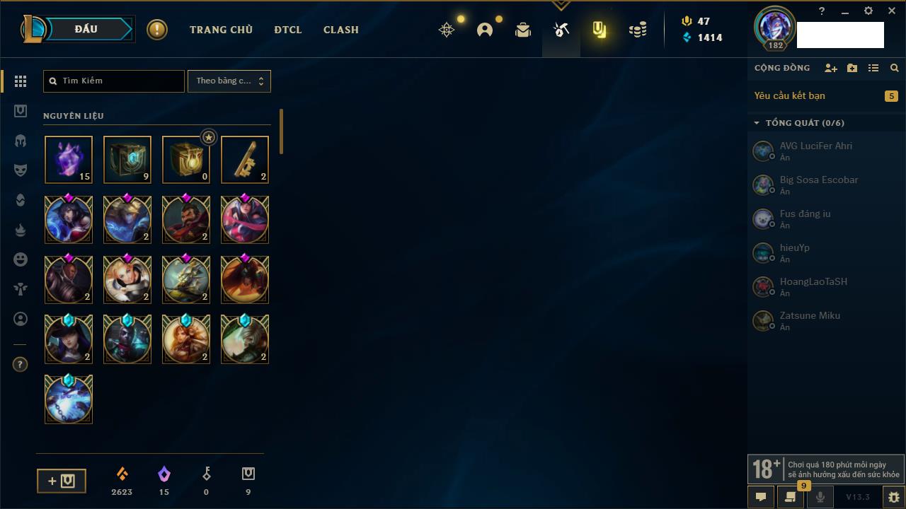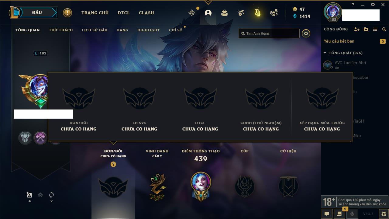Rank Đơn: Đồng IIKhung: Chưa có khungTướng: 170 - Còn 56487 THXTrang Phục: 90Rank ĐTCL: Chưa RankLinh Thú: 129