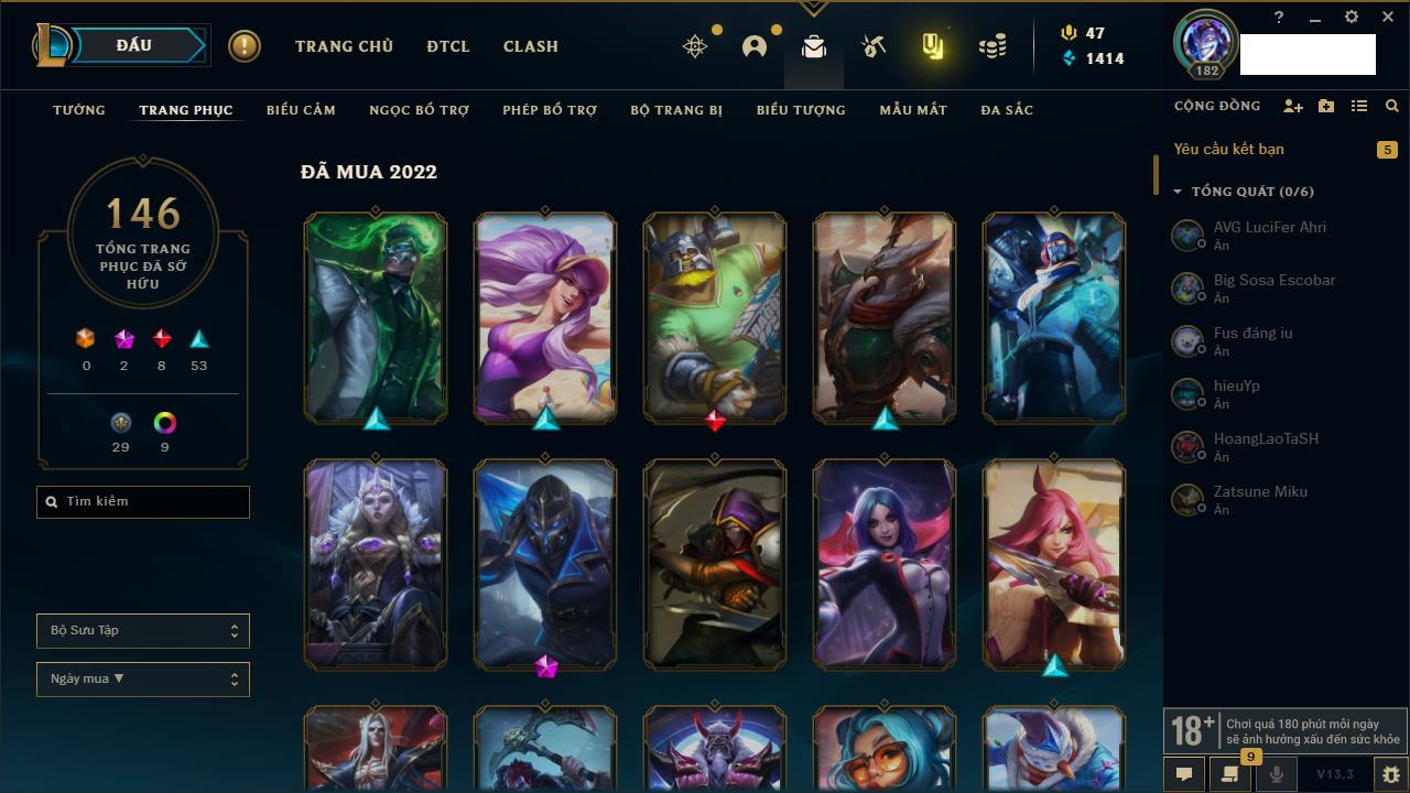 Rank Đơn: Vàng IIIKhung: VàngTướng: 170 - Còn 33222 THXTrang Phục: 136Rank ĐTCL: Chưa RankLinh Thú: 40