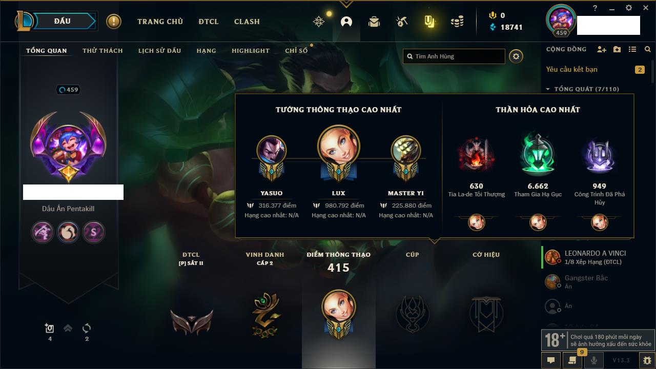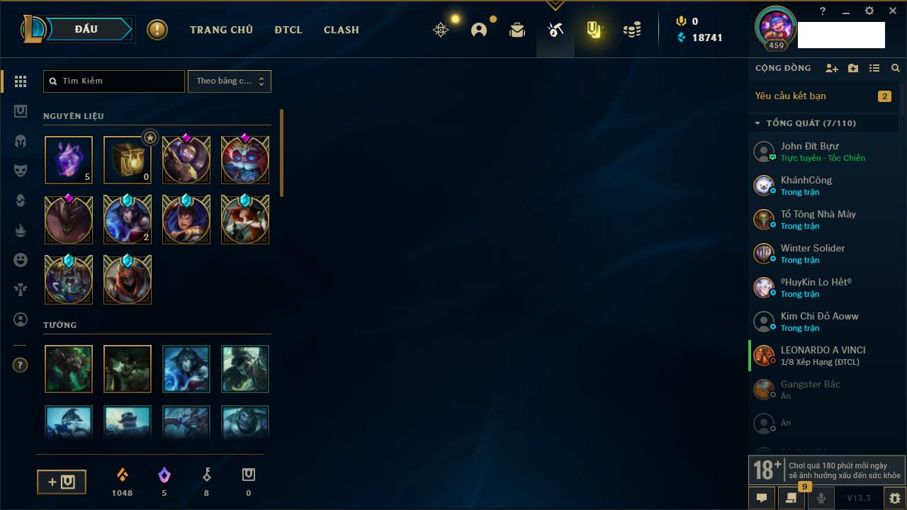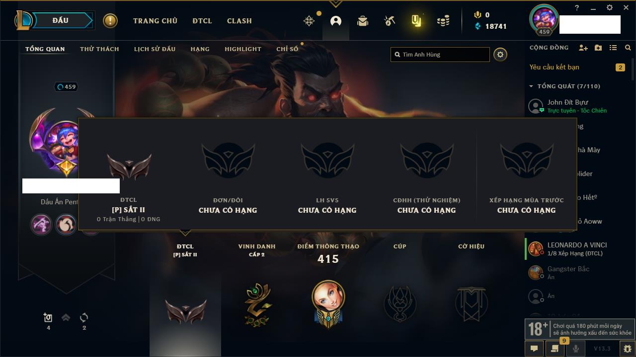 Rank Đơn: Đồng IIKhung: Chưa có khungTướng: 170 - Còn 56487 THXTrang Phục: 90Rank ĐTCL: Chưa RankLinh Thú: 129