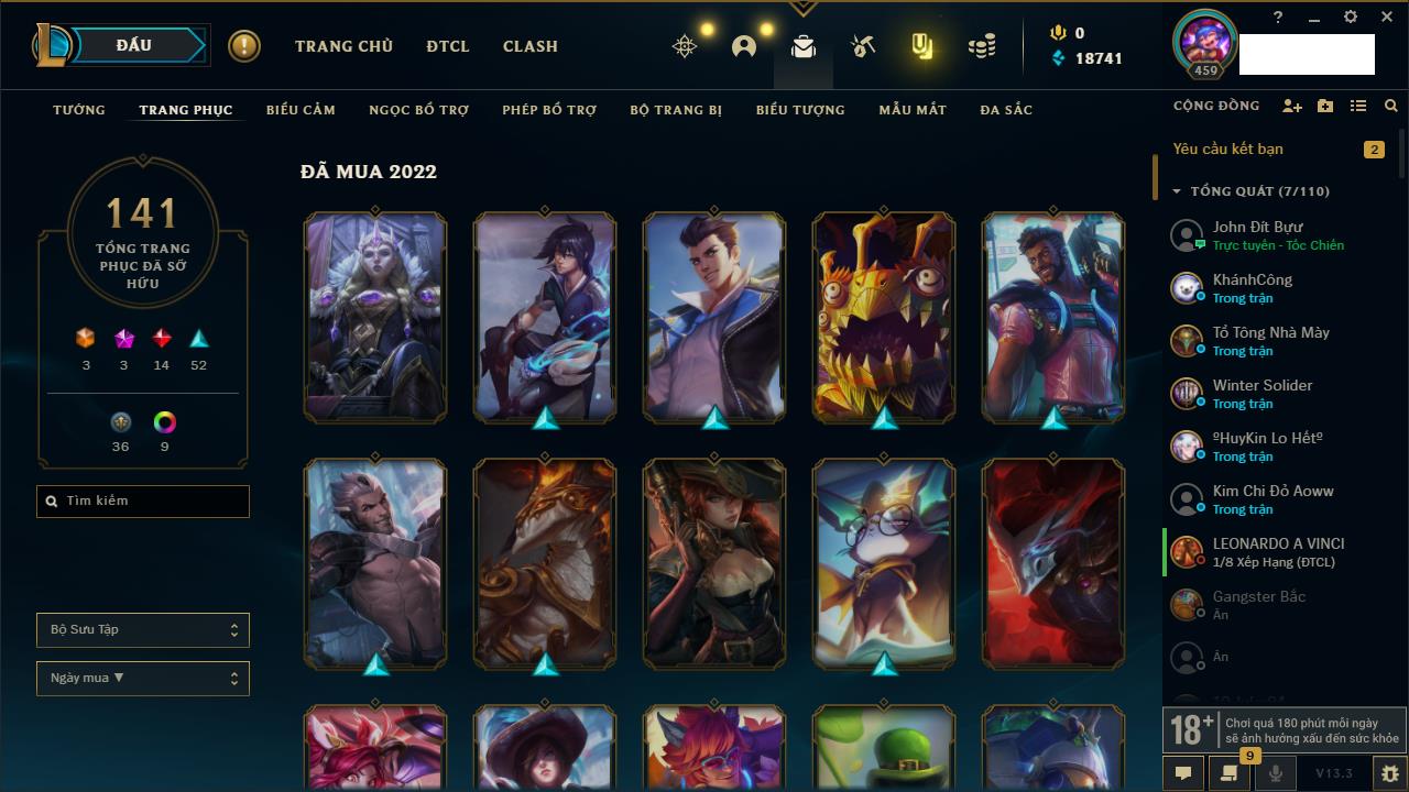 Rank Đơn: Vàng IIIKhung: VàngTướng: 170 - Còn 33222 THXTrang Phục: 136Rank ĐTCL: Chưa RankLinh Thú: 40