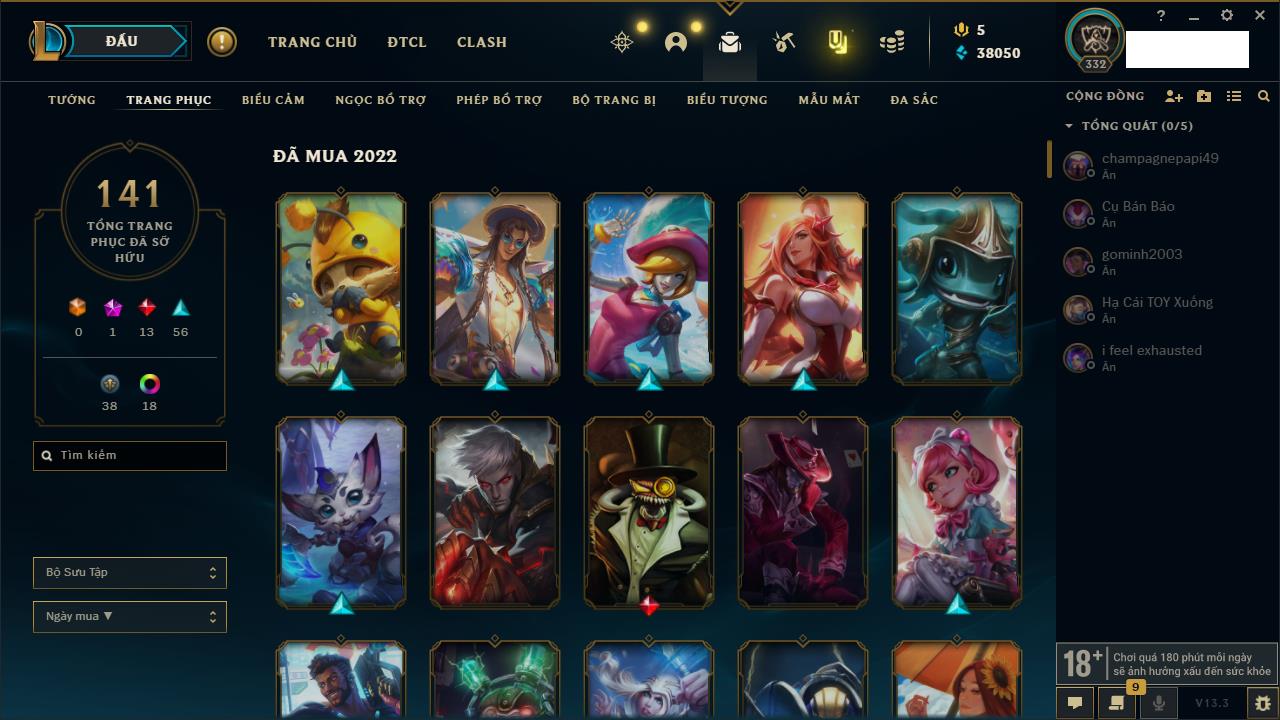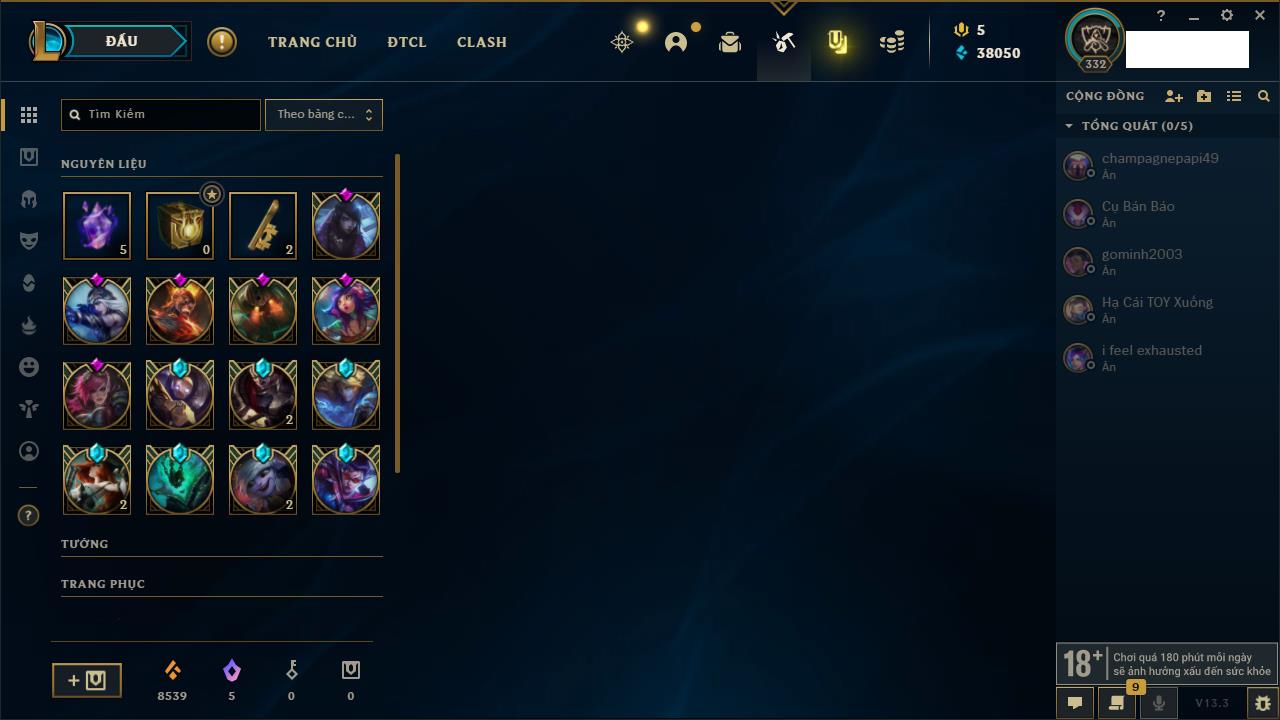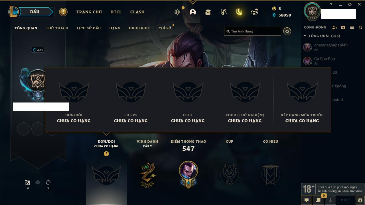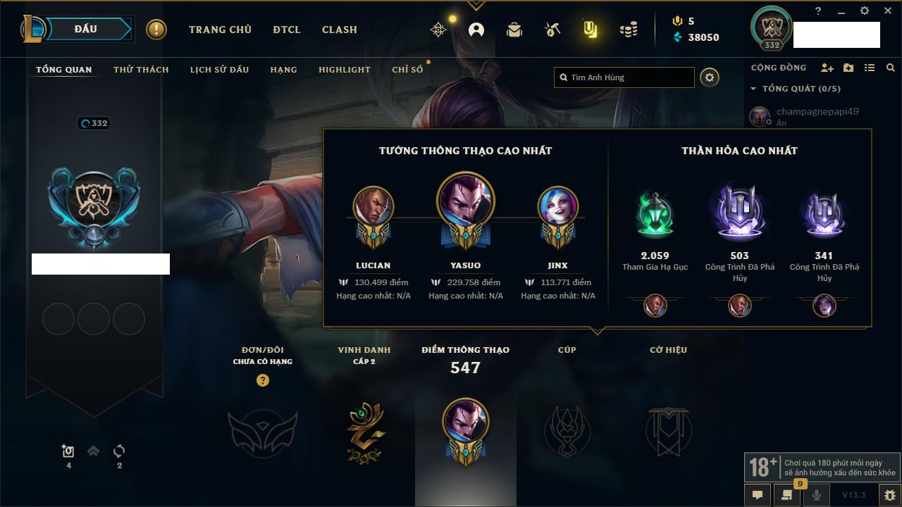 Rank Đơn: Chưa RankKhung: Chưa có khungTướng: 157 - Còn 6783 THXTrang Phục: 50Rank ĐTCL: Chưa RankLinh Thú: 37