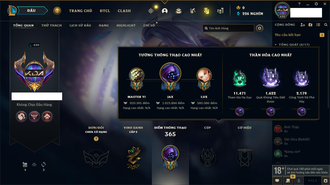 Rank Đơn: Bạc IIIKhung: Chưa có khungTướng: 171 - Còn 21493 THXTrang Phục: 252Rank ĐTCL: Bạch Kim IVLinh Thú: 123
