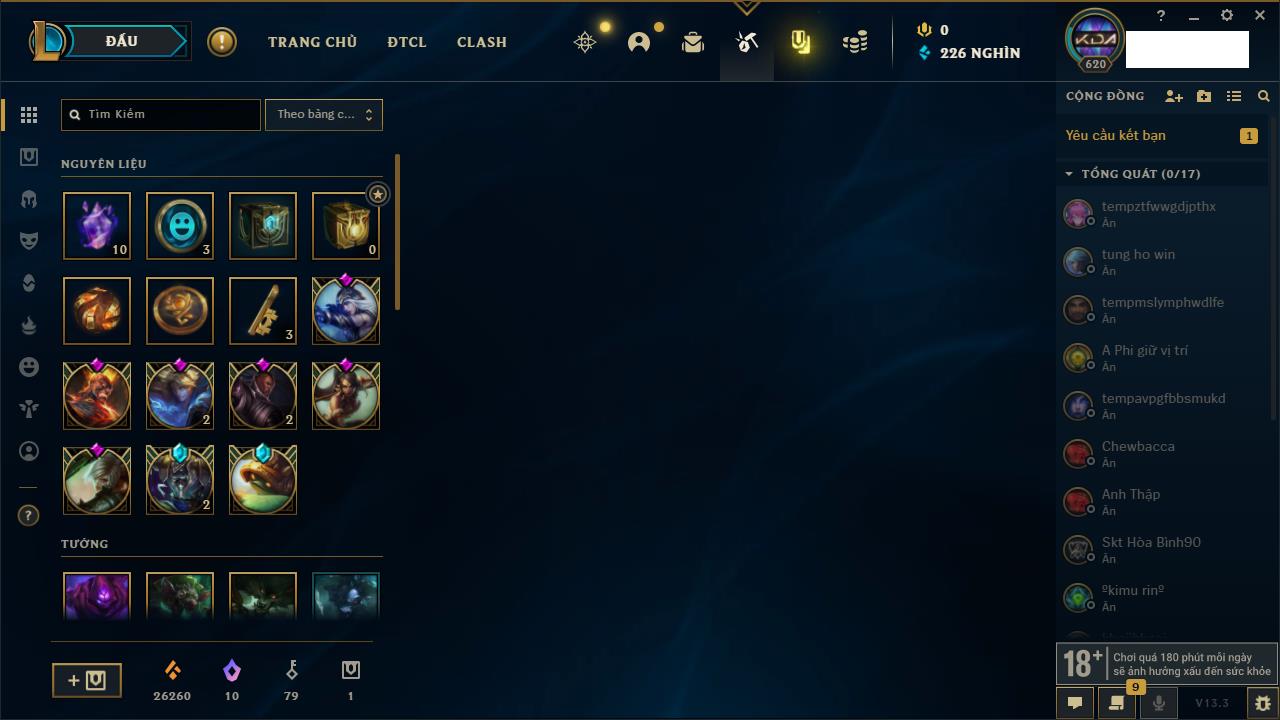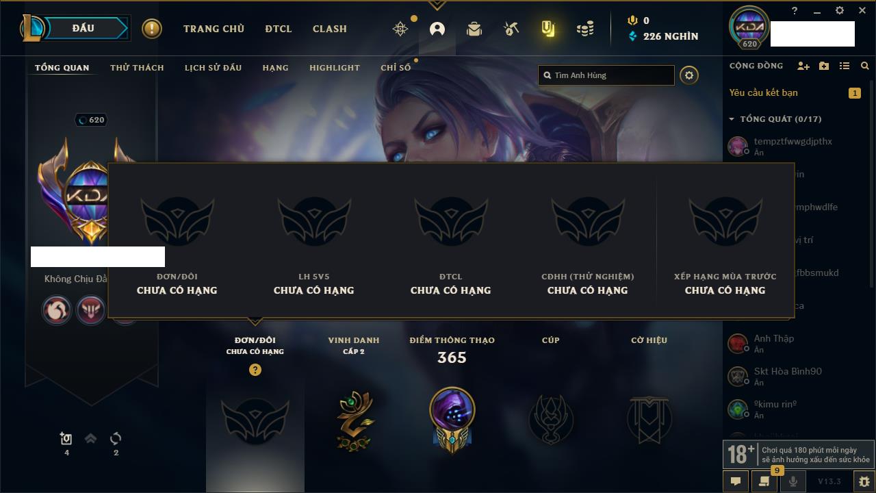 Rank Đơn: Vàng IIKhung: VàngTướng: 171 - Còn 34018 THXTrang Phục: 250Rank ĐTCL: Sắt IILinh Thú: 19