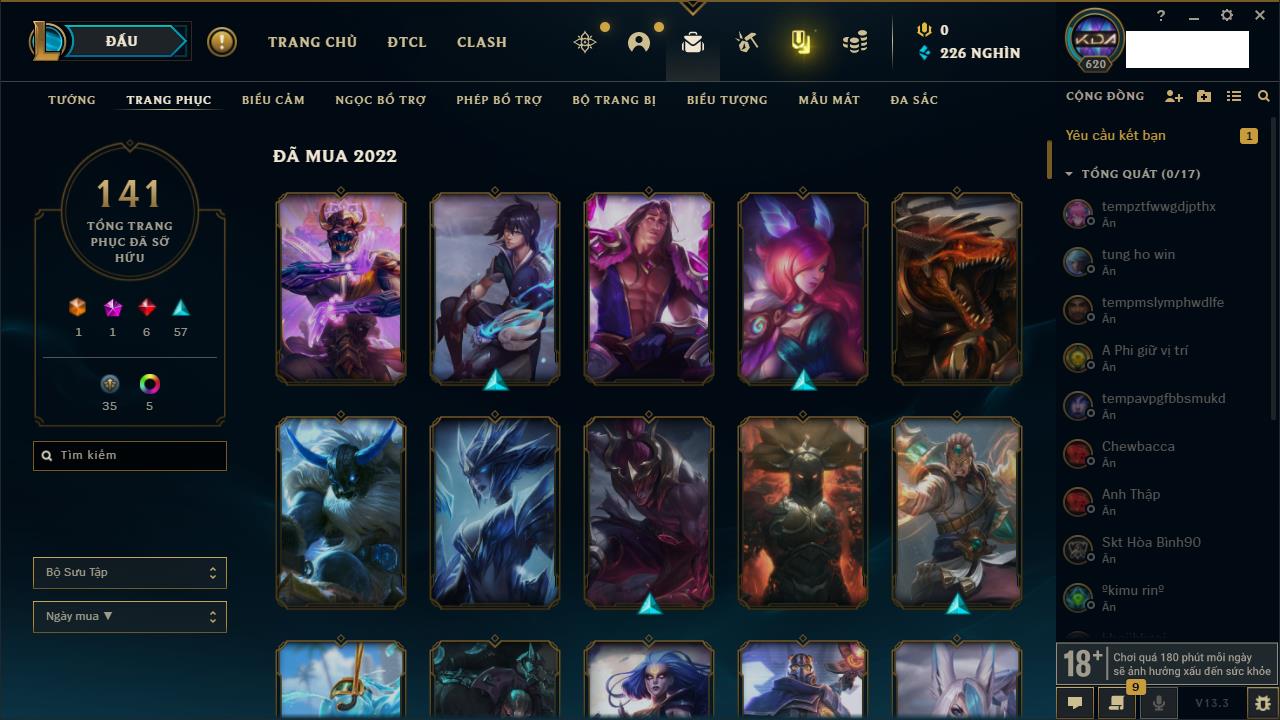 Rank Đơn: Vàng IIIKhung: VàngTướng: 161 - Còn 162202 THXTrang Phục: 179Rank ĐTCL: Chưa RankLinh Thú: 20