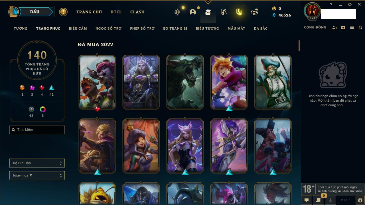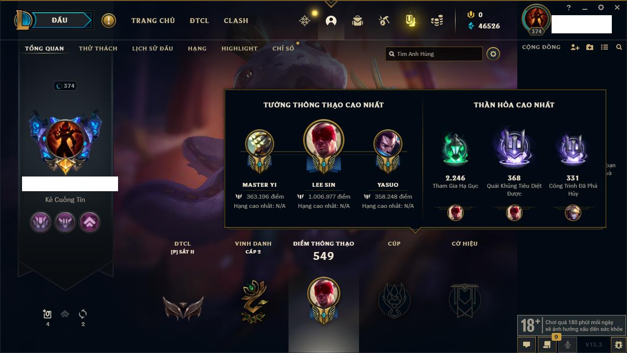 Rank Đơn: Đồng IKhung: ĐồngTướng: 168 - Còn 11447 THXTrang Phục: 245Rank ĐTCL: Chưa RankLinh Thú: 53