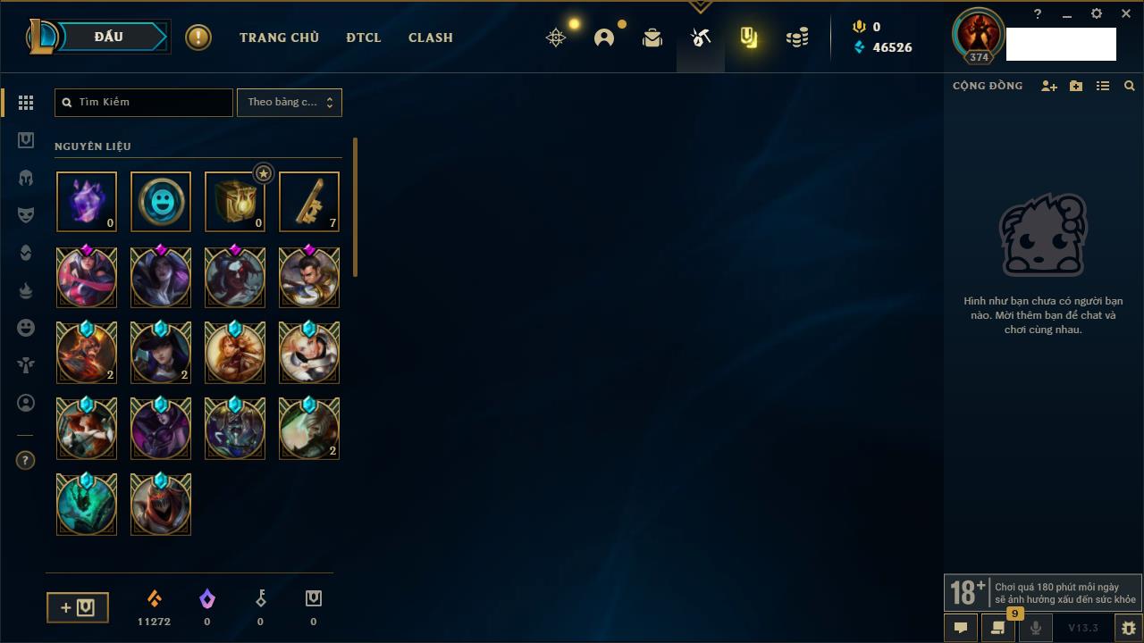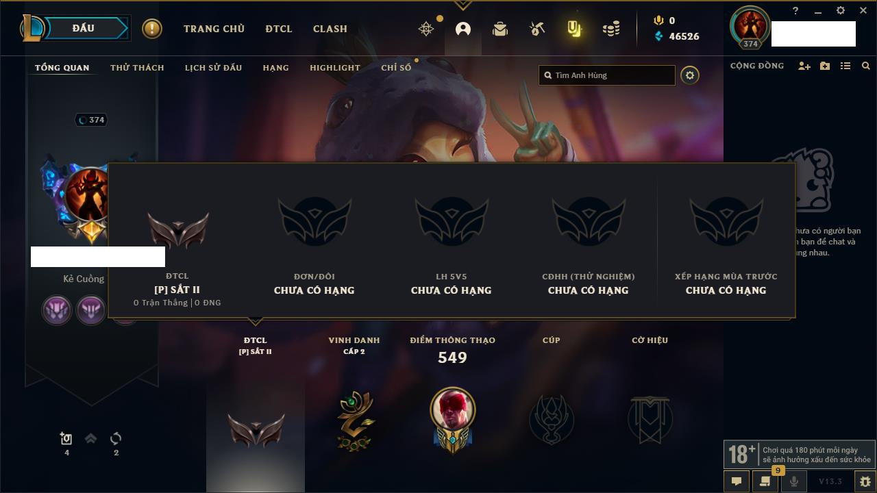 Rank Đơn: Vàng IIIKhung: BạcTướng: 171 - Còn 101359 THXTrang Phục: 88Rank ĐTCL: Kim Cương IVLinh Thú: 200