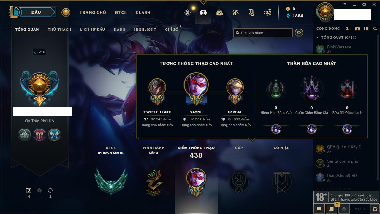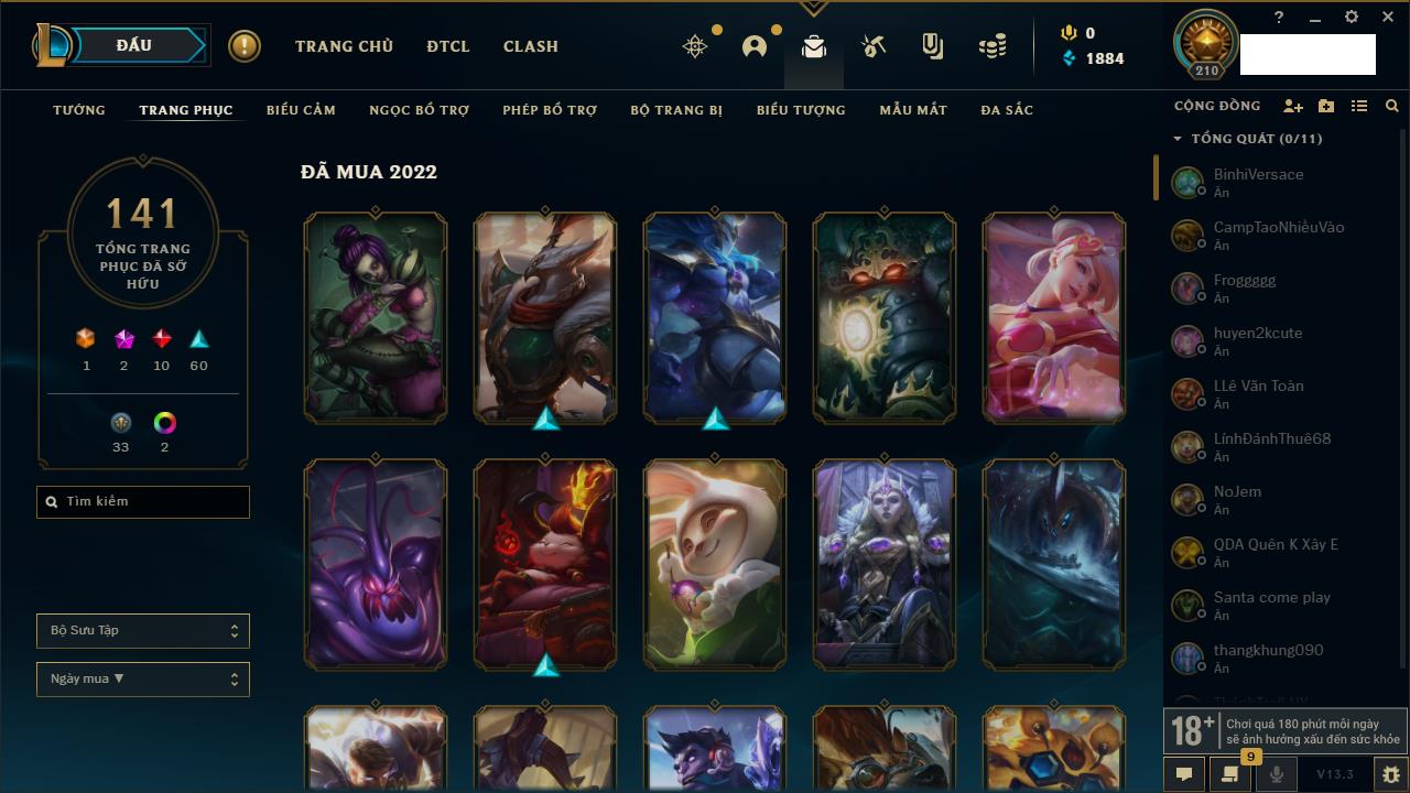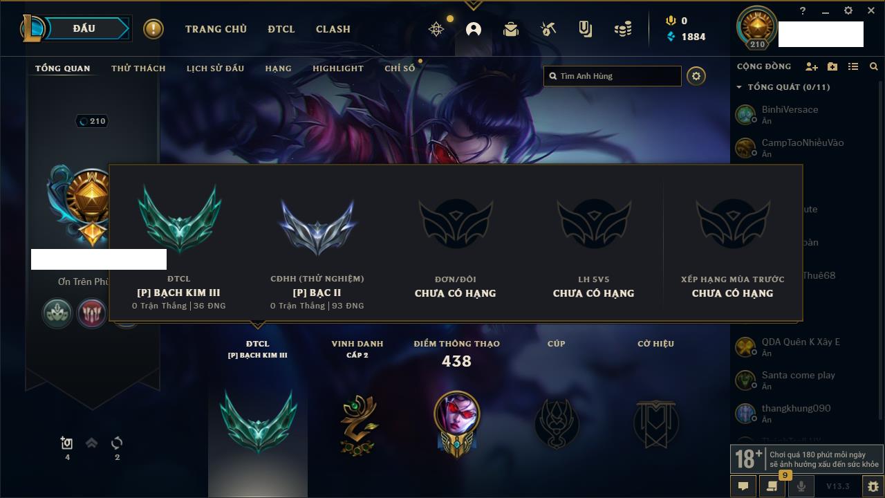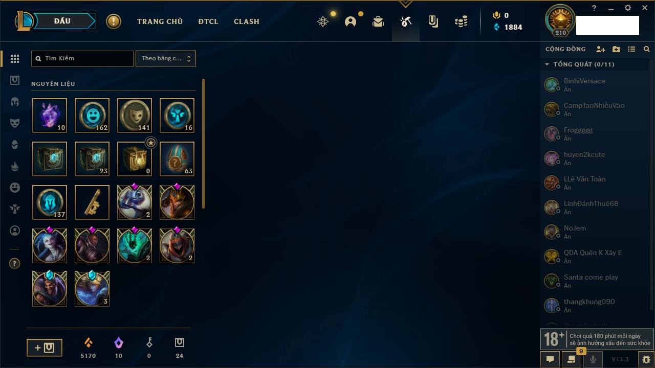 Rank Đơn: Đồng IIKhung: Chưa có khungTướng: 170 - Còn 56487 THXTrang Phục: 90Rank ĐTCL: Chưa RankLinh Thú: 129