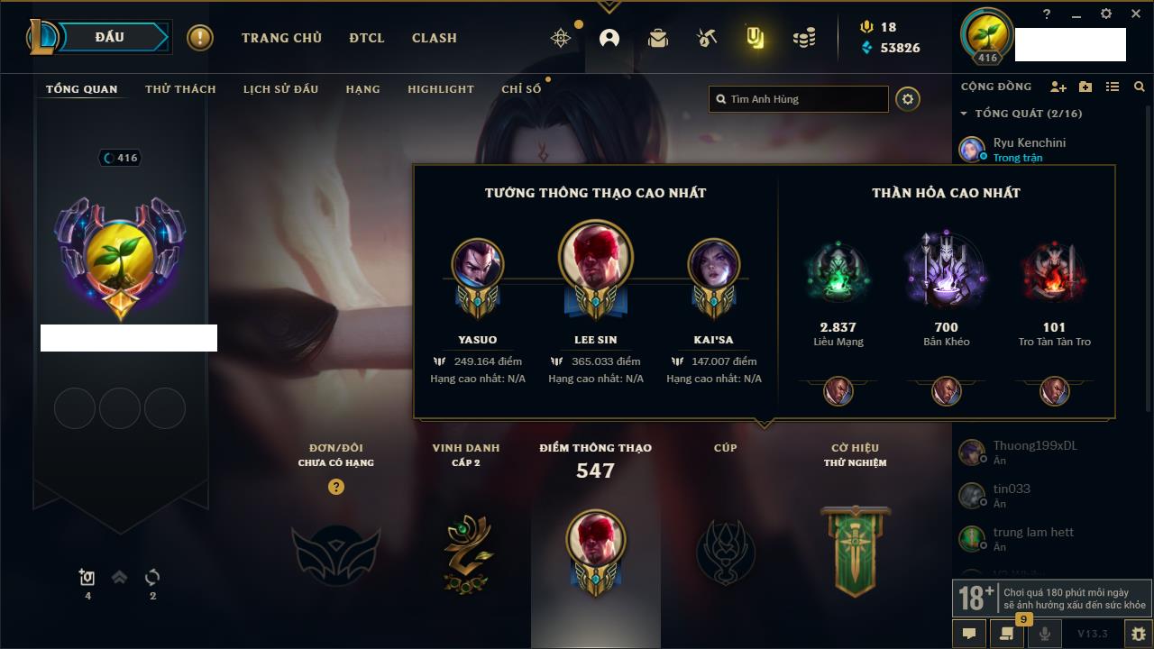 Rank Đơn: Chưa RankKhung: Chưa có khungTướng: 168 - Còn 70824 THXTrang Phục: 155Rank ĐTCL: Chưa RankLinh Thú: 53