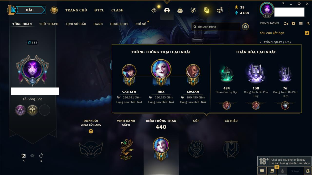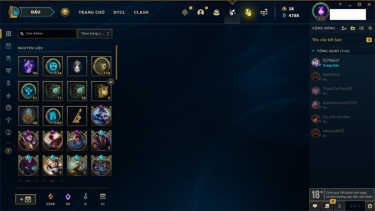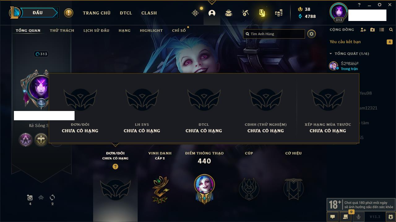 Rank Đơn: Bạc IVKhung: BạcTướng: 171 - Còn 102637 THXTrang Phục: 169Rank ĐTCL: Vàng IILinh Thú: 127