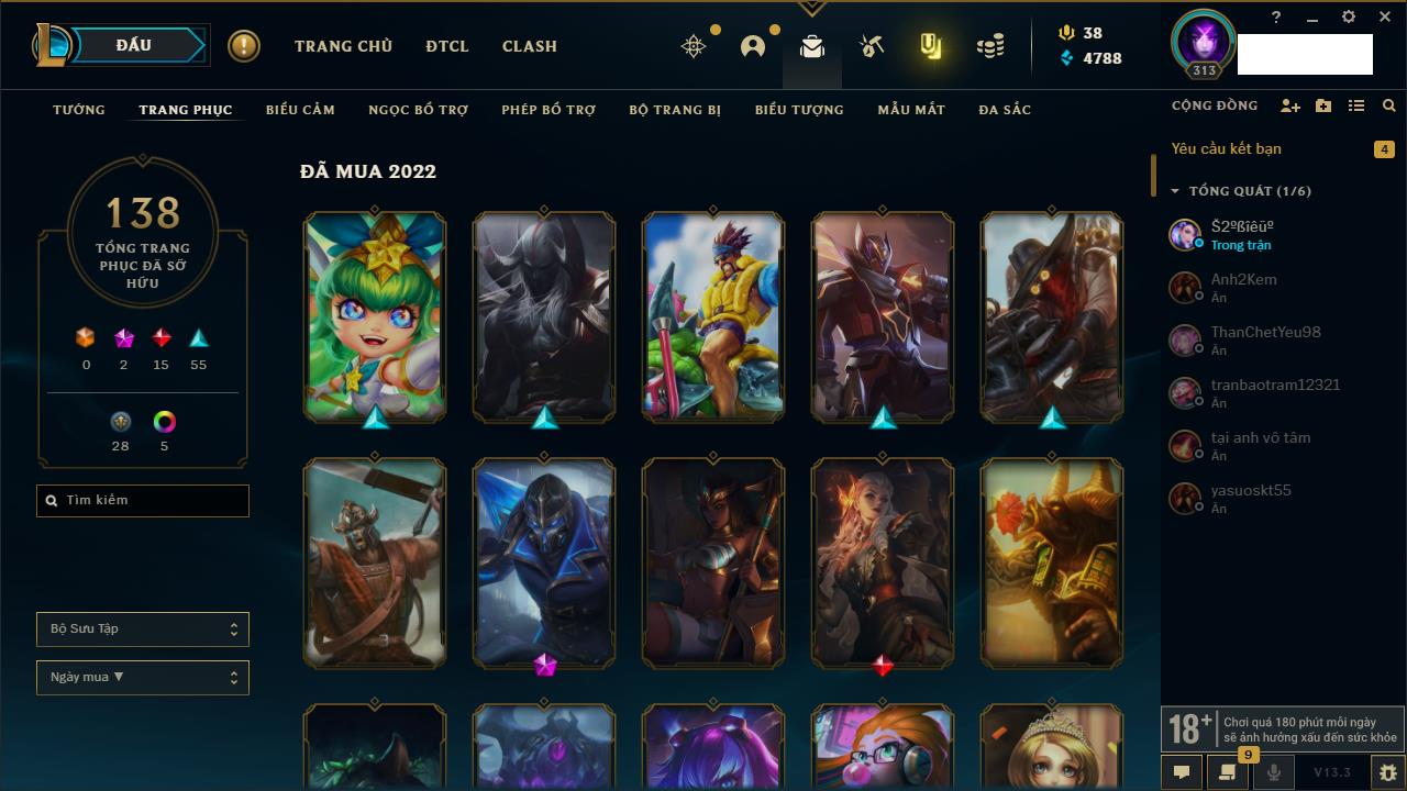 Rank Đơn: Bạc IIIKhung: BạcTướng: 168 - Còn 101710 THXTrang Phục: 184Rank ĐTCL: Chưa RankLinh Thú: 17