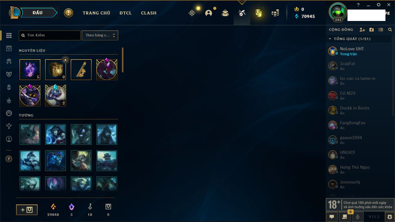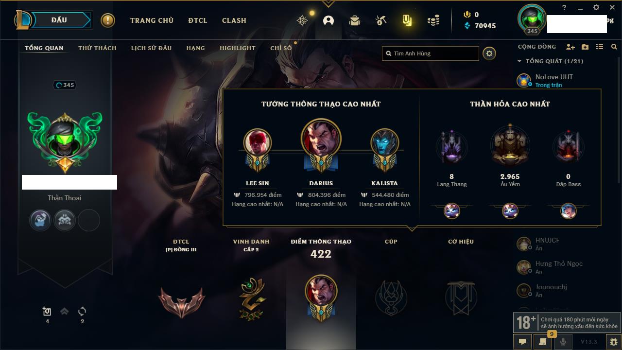 Rank Đơn: Vàng IVKhung: BạcTướng: 171 - Còn 426239 THXTrang Phục: 162Rank ĐTCL: Chưa RankLinh Thú: 33