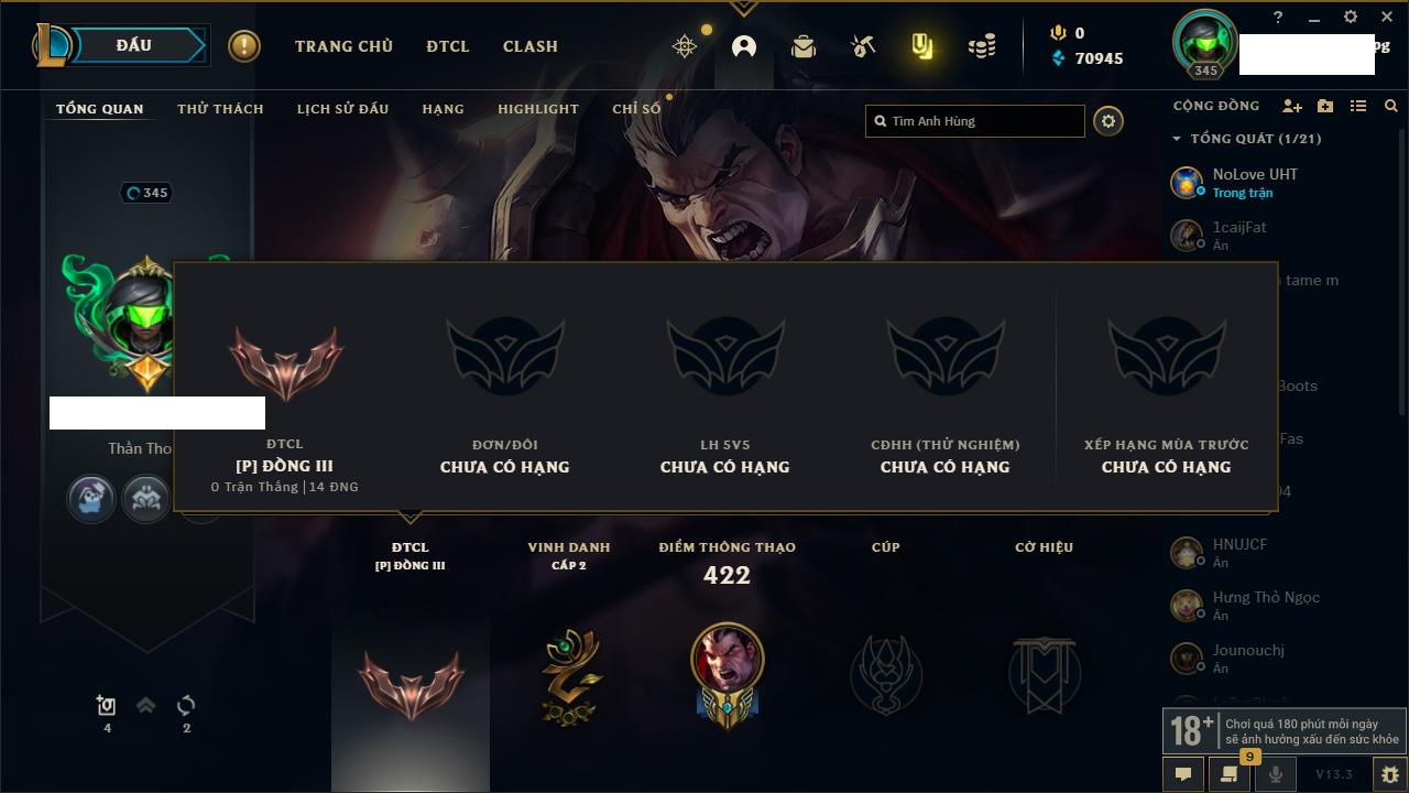 Rank Đơn: Sắt IKhung: SắtTướng: 171 - Còn 125789 THXTrang Phục: 151Rank ĐTCL: Đồng IIILinh Thú: 72