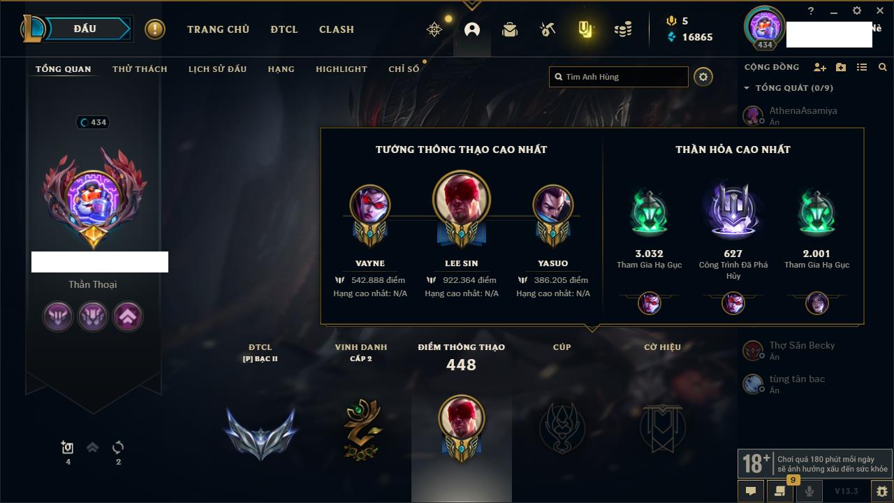 Rank Đơn: Vàng IVKhung: VàngTướng: 171 - Còn 48721 THXTrang Phục: 171Rank ĐTCL: Chưa RankLinh Thú: 27