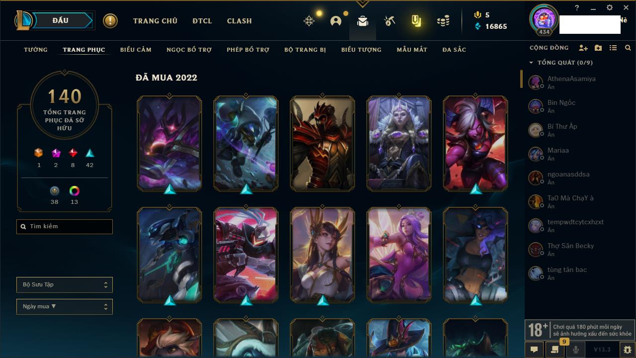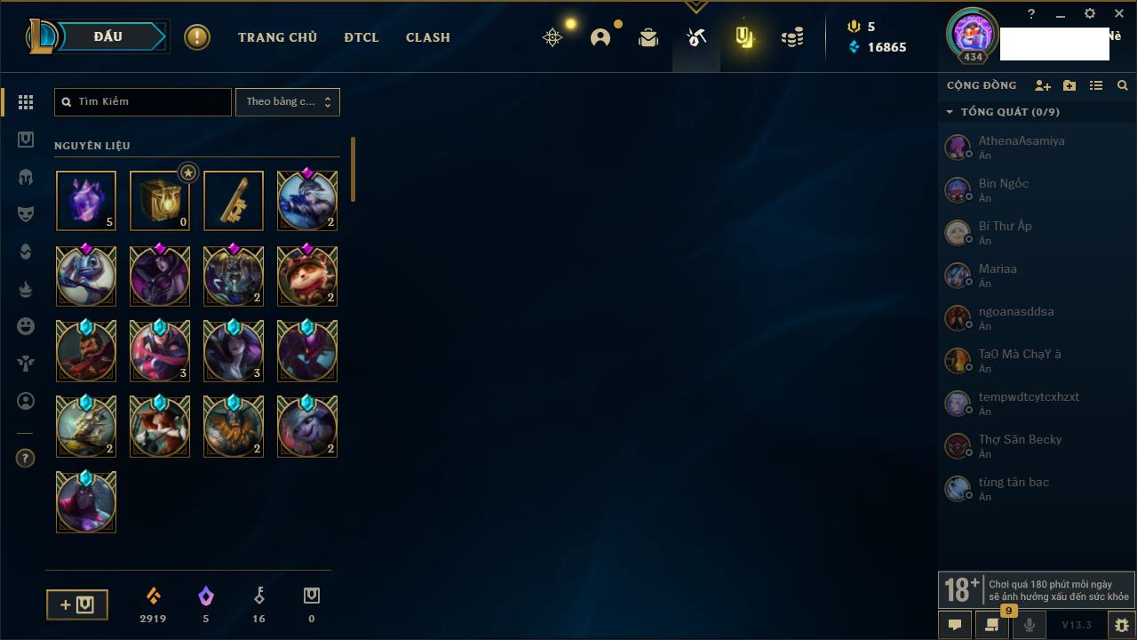 Rank Đơn: Vàng IVKhung: BạcTướng: 171 - Còn 426239 THXTrang Phục: 162Rank ĐTCL: Chưa RankLinh Thú: 33