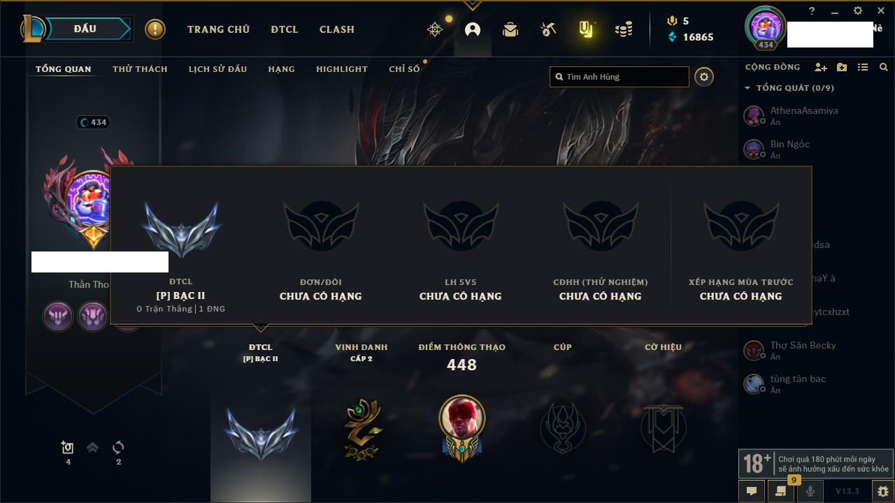 Rank Đơn: Bạc IIKhung: VàngTướng: 171 - Còn 332462 THXTrang Phục: 165Rank ĐTCL: Kim Cương IVLinh Thú: 181