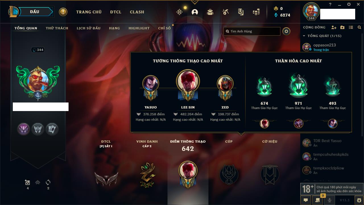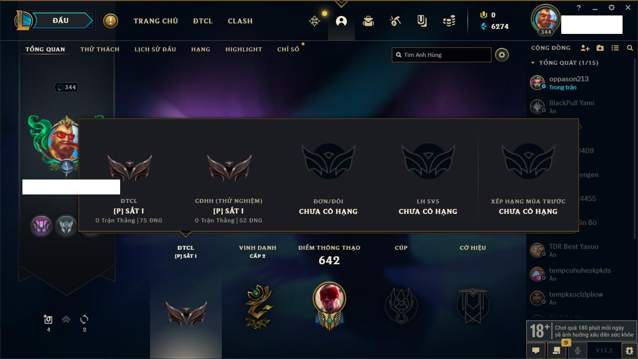 Rank Đơn: Đồng IIKhung: Chưa có khungTướng: 170 - Còn 56487 THXTrang Phục: 90Rank ĐTCL: Chưa RankLinh Thú: 129