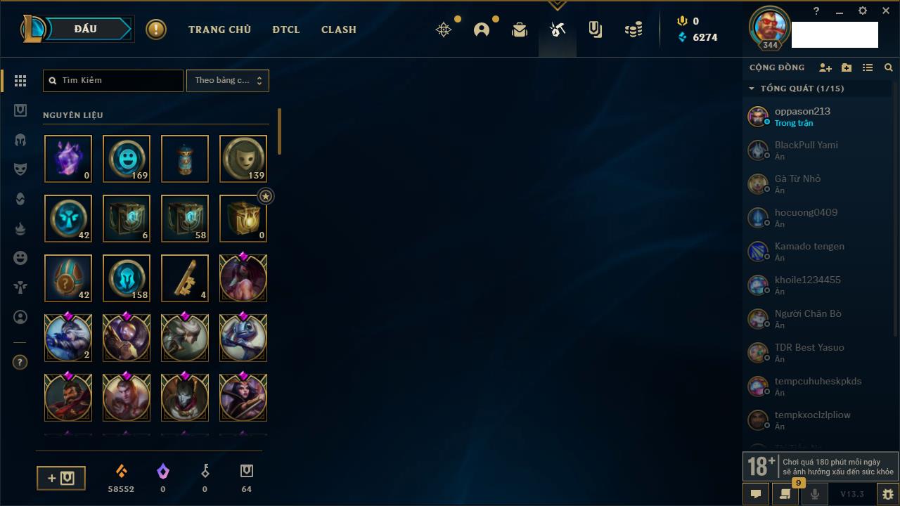 Rank Đơn: Chưa RankKhung: Chưa có khungTướng: 157 - Còn 6783 THXTrang Phục: 50Rank ĐTCL: Chưa RankLinh Thú: 37