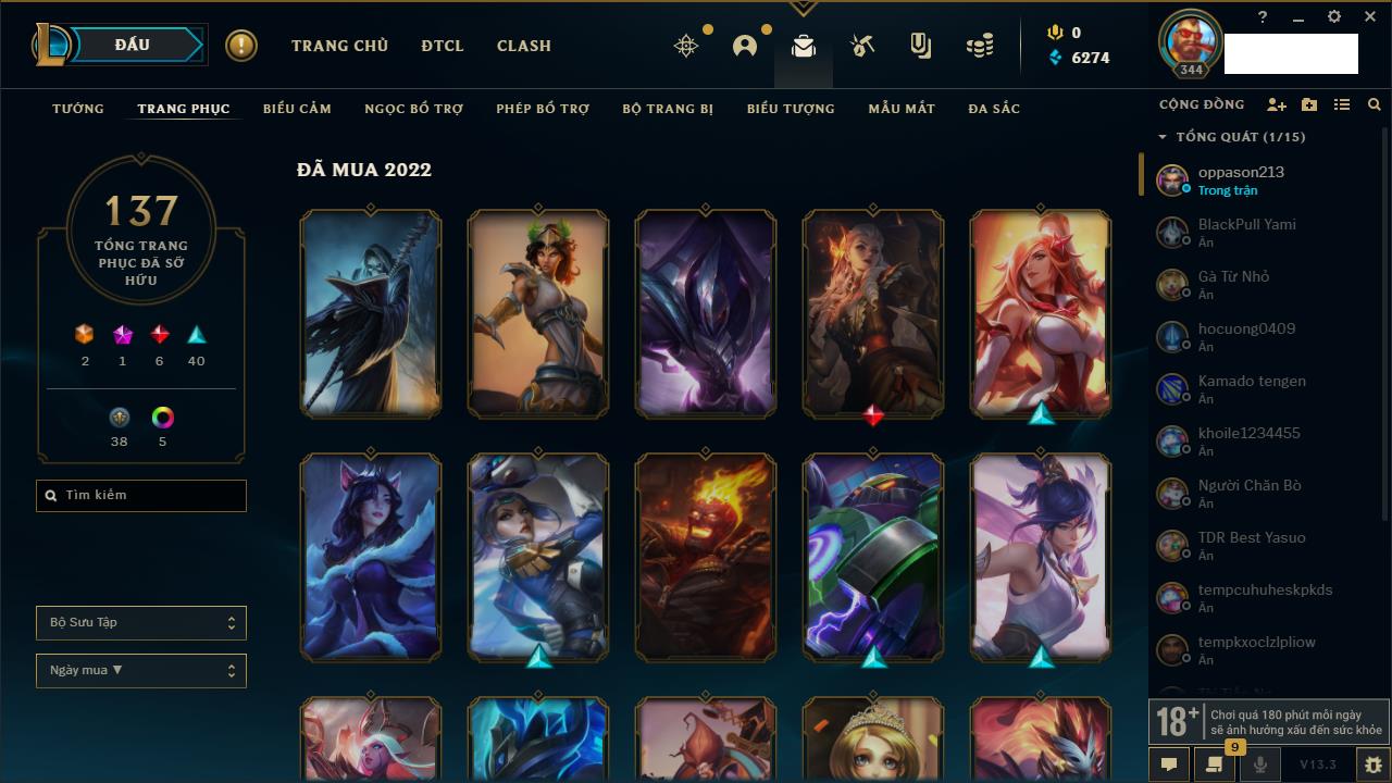 Rank Đơn: Vàng IIIKhung: VàngTướng: 170 - Còn 33222 THXTrang Phục: 136Rank ĐTCL: Chưa RankLinh Thú: 40