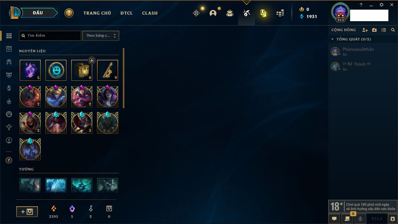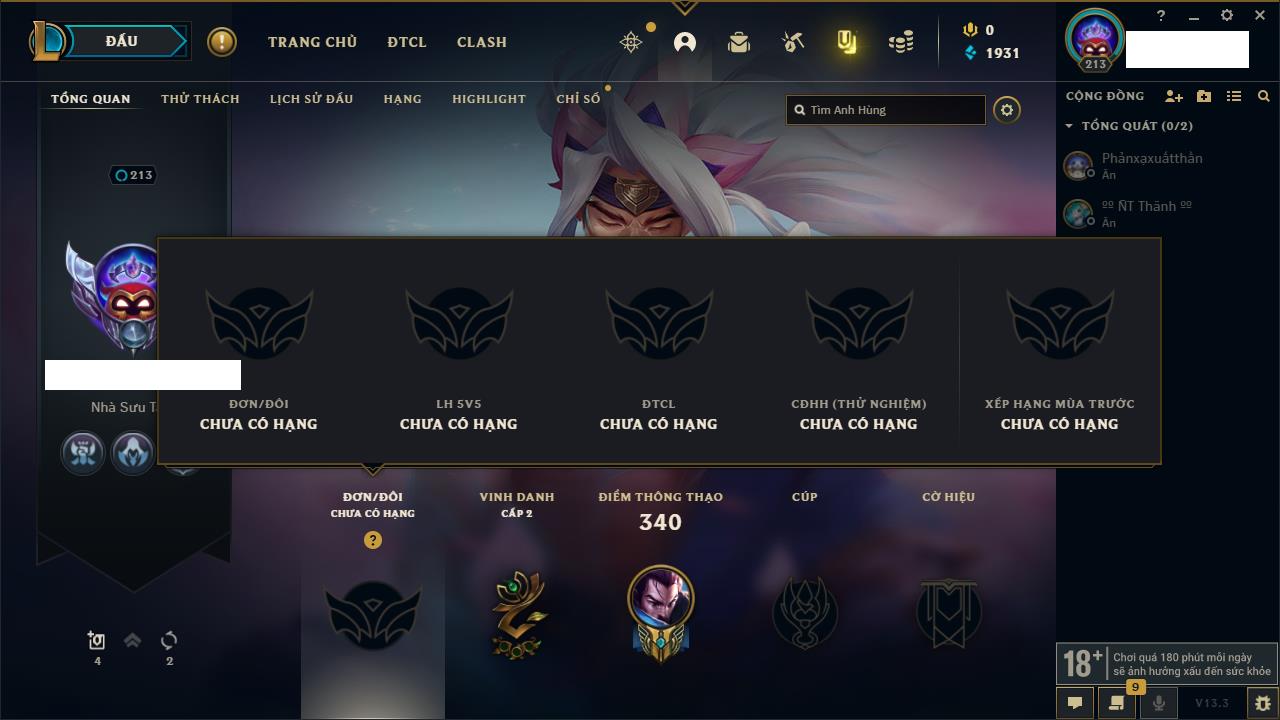 Rank Đơn: Vàng IVKhung: BạcTướng: 171 - Còn 426239 THXTrang Phục: 162Rank ĐTCL: Chưa RankLinh Thú: 33