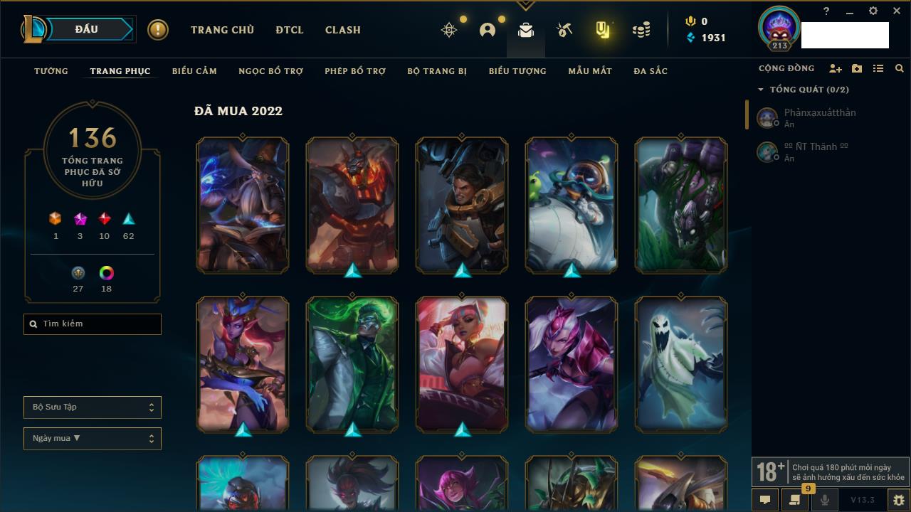 Rank Đơn: Vàng IVKhung: VàngTướng: 171 - Còn 48721 THXTrang Phục: 171Rank ĐTCL: Chưa RankLinh Thú: 27