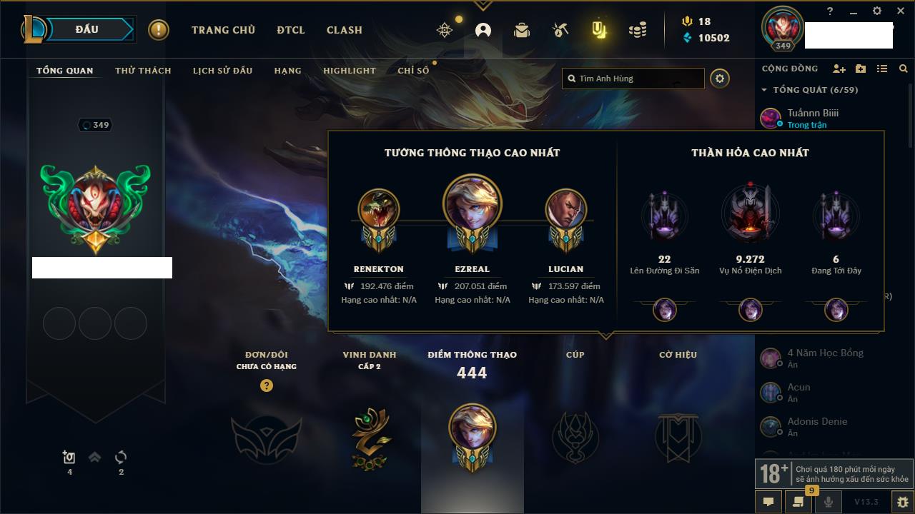Rank Đơn: Chưa RankKhung: Chưa có khungTướng: 165 - Còn 10028 THXTrang Phục: 192Rank ĐTCL: Chưa RankLinh Thú: 13
