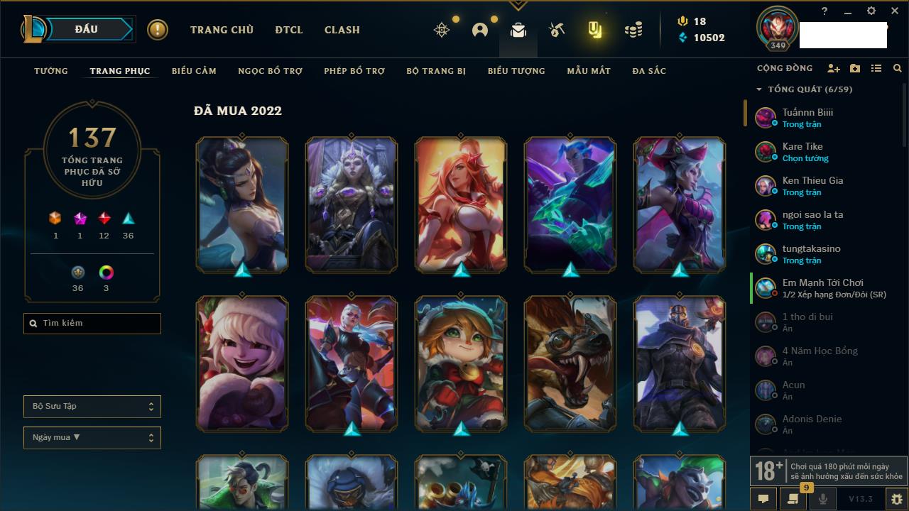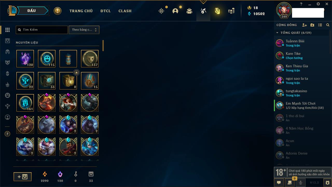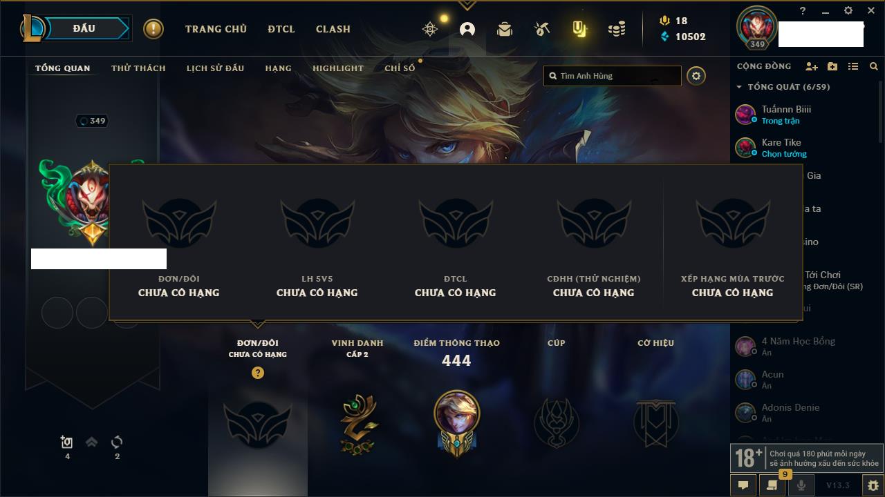 Rank Đơn: Bạc IVKhung: BạcTướng: 171 - Còn 102637 THXTrang Phục: 169Rank ĐTCL: Vàng IILinh Thú: 127