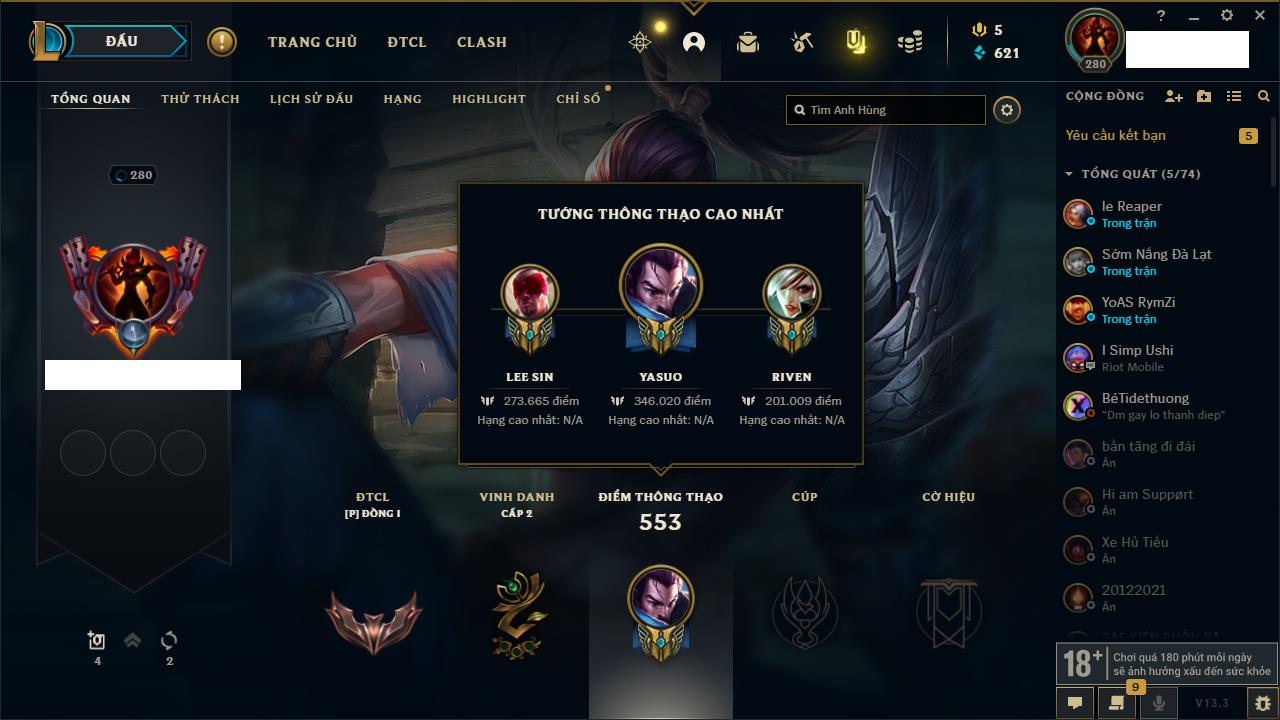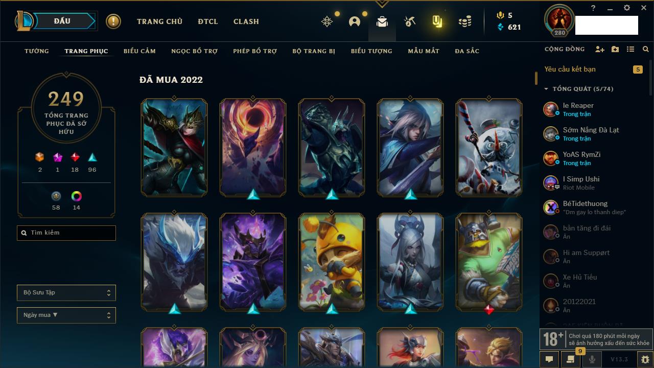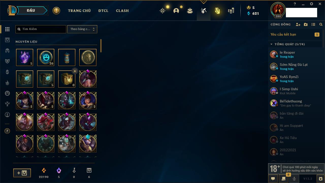 Rank Đơn: Vàng IIIKhung: BạcTướng: 171 - Còn 101359 THXTrang Phục: 88Rank ĐTCL: Kim Cương IVLinh Thú: 200