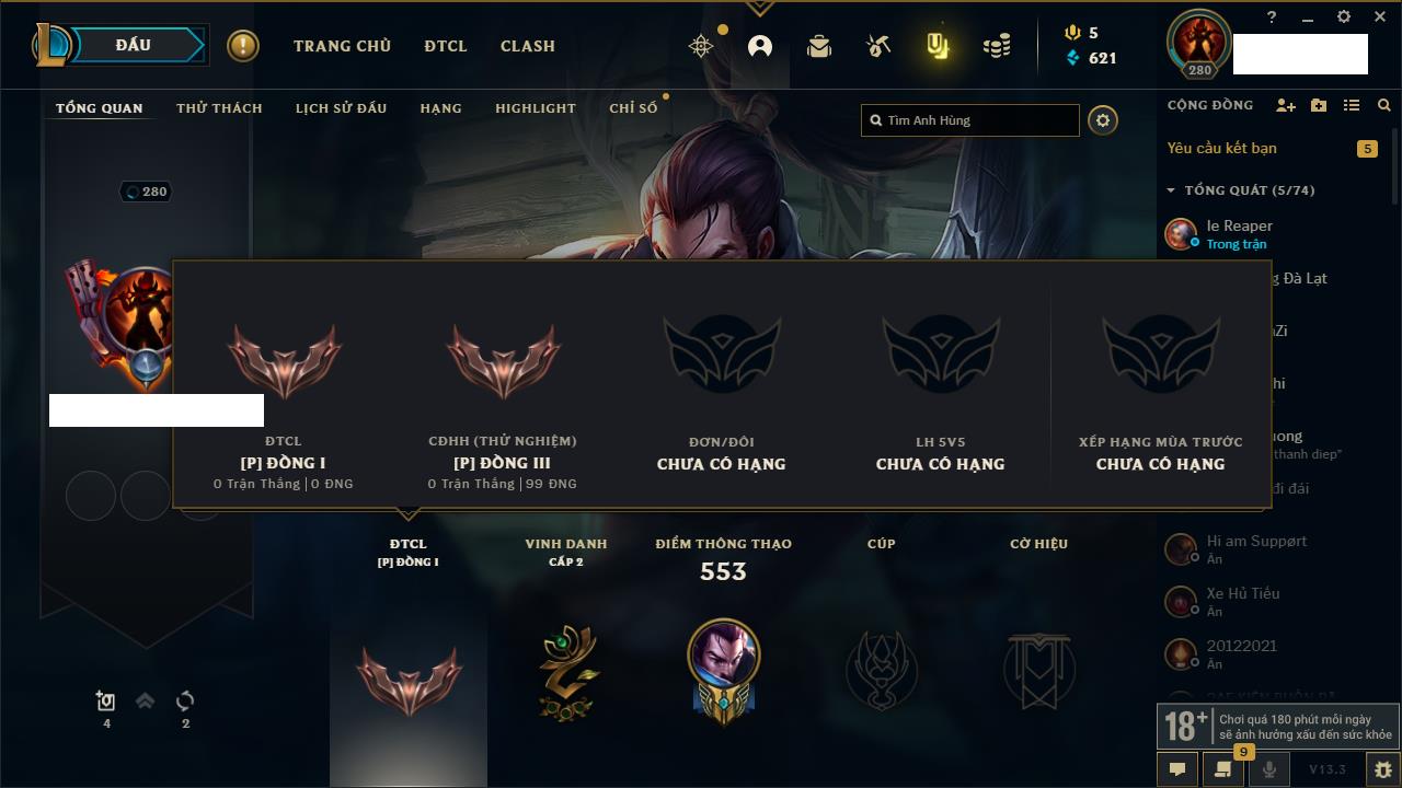 Rank Đơn: Đồng IKhung: ĐồngTướng: 168 - Còn 11447 THXTrang Phục: 245Rank ĐTCL: Chưa RankLinh Thú: 53