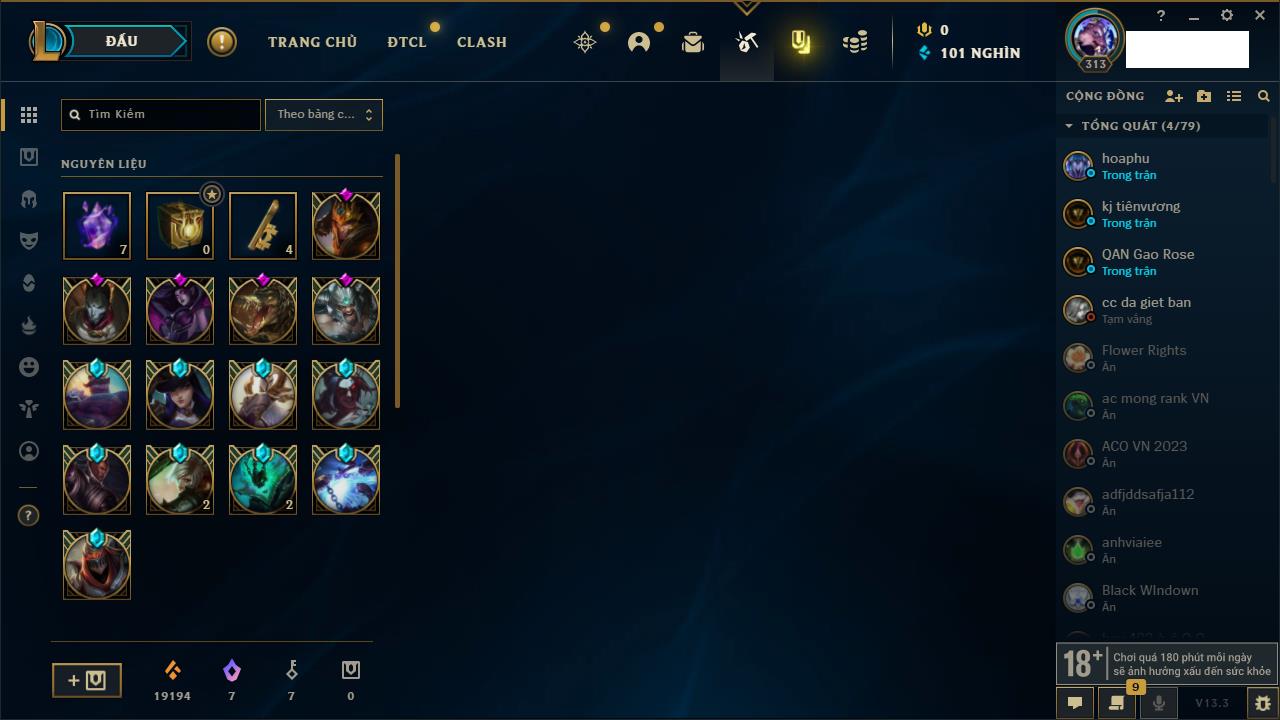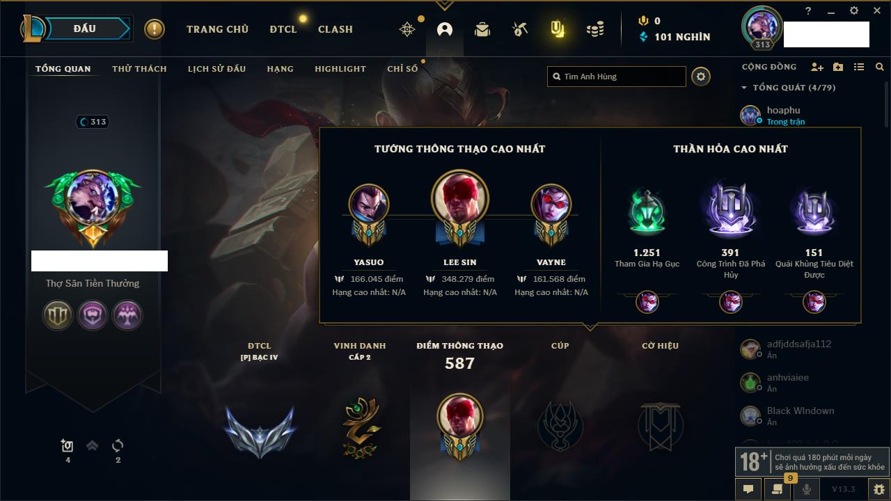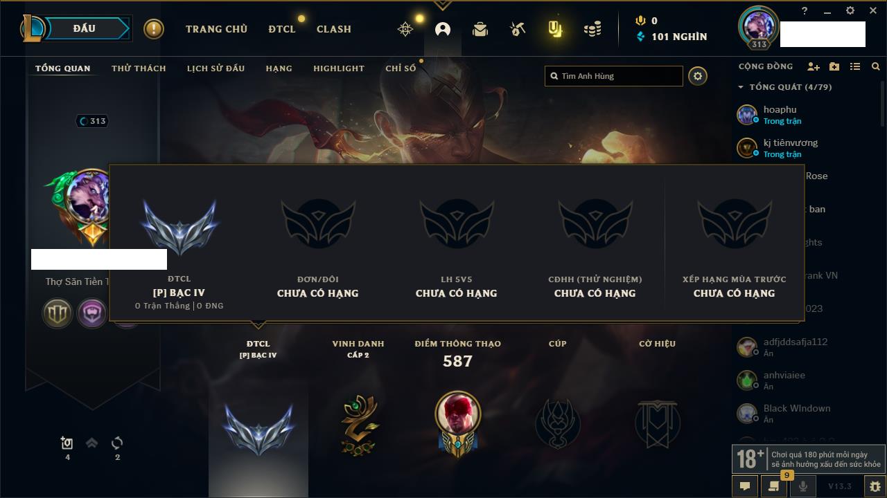 Rank Đơn: Vàng IVKhung: BạcTướng: 171 - Còn 231097 THXTrang Phục: 180Rank ĐTCL: Vàng IVLinh Thú: 110