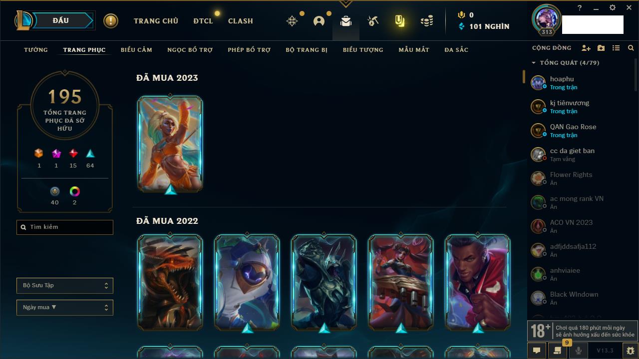 Rank Đơn: Vàng IVKhung: VàngTướng: 171 - Còn 48721 THXTrang Phục: 171Rank ĐTCL: Chưa RankLinh Thú: 27