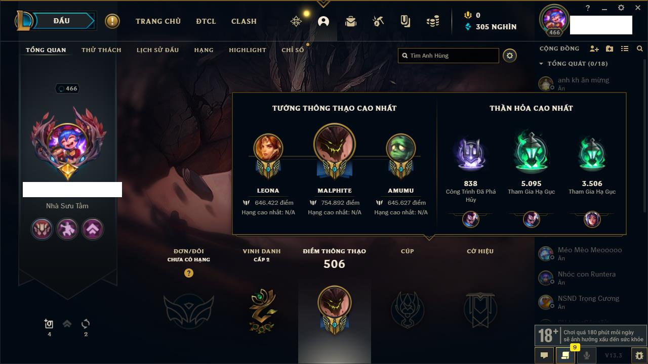 Rank Đơn: Lục Bảo IVKhung: Bạch kimTướng: 171 - Còn 128452 THXTrang Phục: 193Rank ĐTCL: Bạc IIILinh Thú: 100